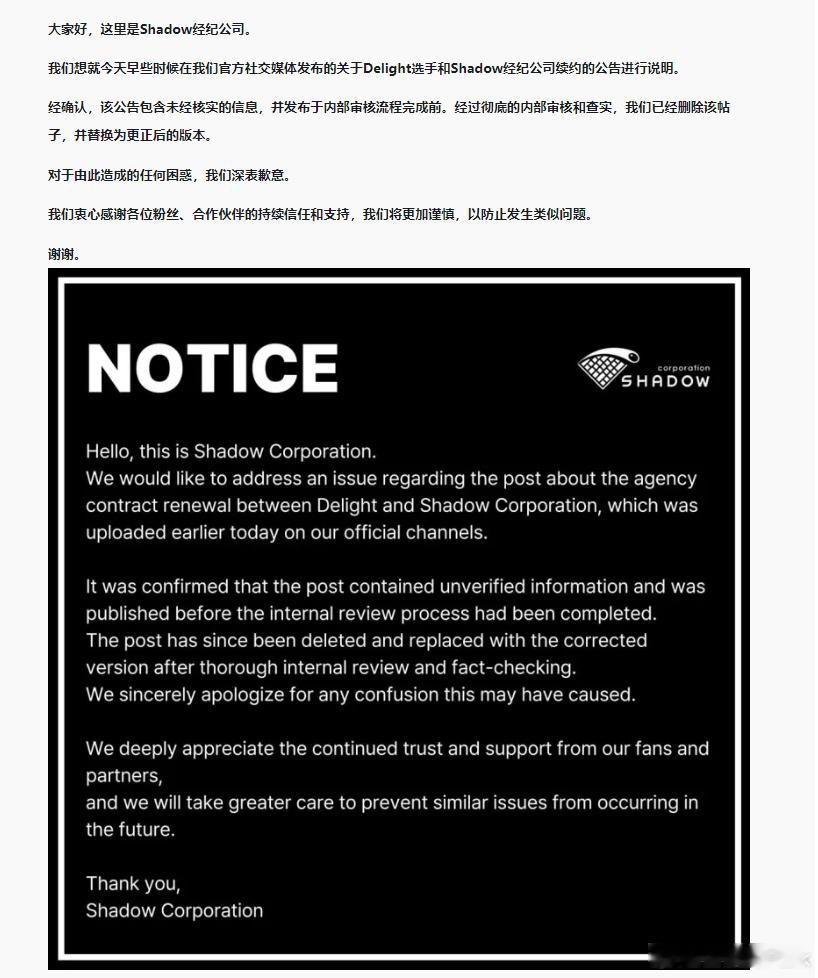 Shadow经纪公司搞笑来的,本来是Delight与经纪公司续约,结果写成了和HLE续约。