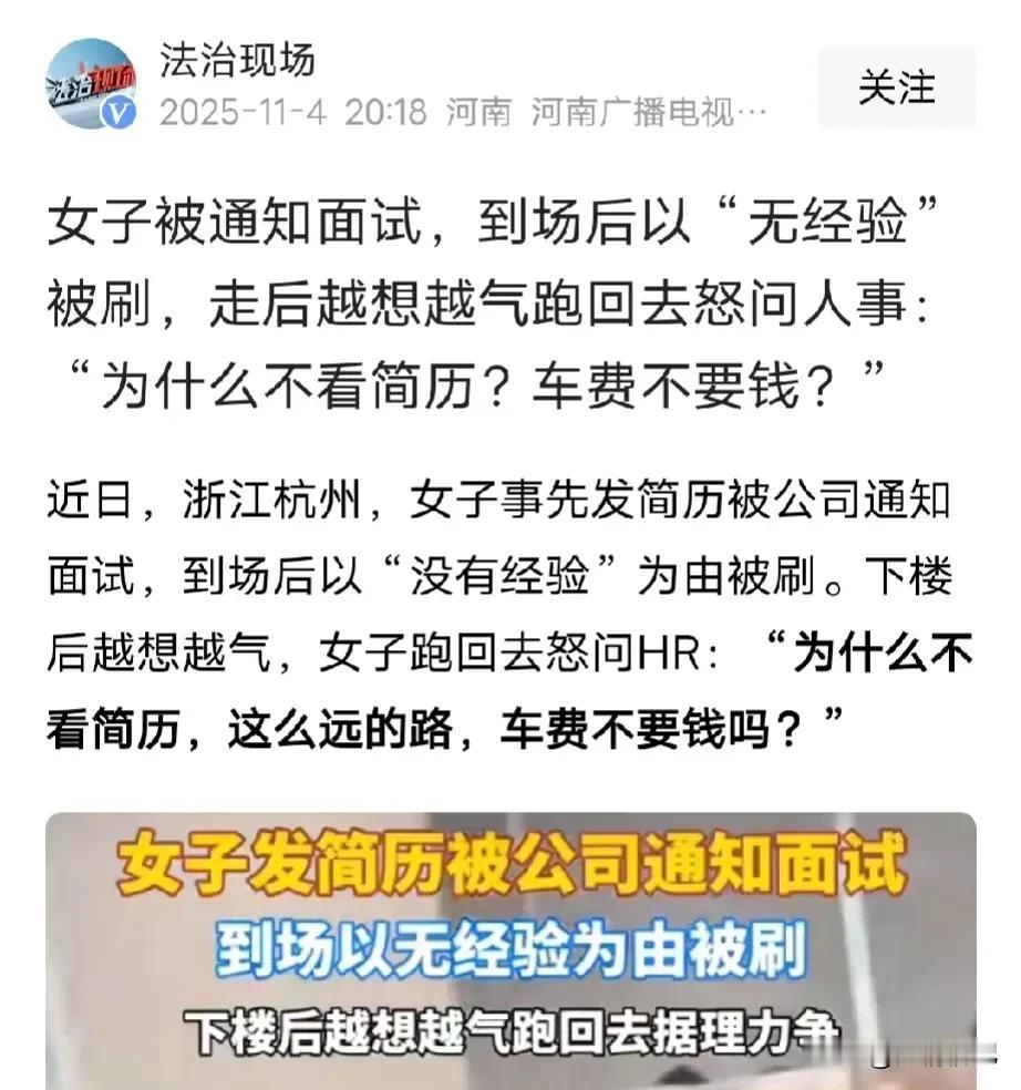 浙江杭州,女子在网上给某公司投了简历后,被通知面试,女子于是请了半天假,花了20多块钱打车到该公司,谁料,到场不到10分钟,却被告知“经验不足”被刷了,女子离开后越想越气,转身怒怼面试官:我的简历上写的很清楚,你真的看过了吗,那么远的路,车费不要钱?面试官先是愣了一下,随后找理由敷衍。 这是刚在网上看到的一件事,26岁的马女士,3年行政经验,看到一家公司招“行政主管助理”,岗位写着“1-3年经验优先,接受经验浅者”,她觉得稳稳符合,立马投了简历。 很快,面试通知来了。她特意请了假,改简历、打材料,提前一个半小时出门,坐了一个多小时公交,花了20多块打车费,一身汗赶到公司,就为好好表现一次。 结果呢? 刚坐下,自我介绍还没说完,HR翻了两眼简历,轻飘飘来一句:“我们要的是有互联网行业经验的,你这个不太合适。” 马女士当场愣住:“招聘要求里没写必须有互联网背景啊?” HR低头看了看,居然说:“初筛时没注意,看太快了。” 就这么一句话,三小时的路白跑了,请假白请了,连展示专业能力的机会都没有。 她走出大楼,越想越气——我的简历白纸黑字写得清清楚楚,你没看,怪我? 转身就杀回去! 当面质问:“你们真的看过我简历吗?那么远的路,车费不要钱?时间不要成本?” HR支支吾吾,只说“流程疏漏”,一句道歉都没有。 马女士不惯着,回家剪了条视频发网上,晒出岗位截图、简历、沟通记录,就一句话:“我们打工人,不该被当儿戏。” 结果公司反手就举报,说她“泄露商业信息”,视频被下架,甚至还报警,称“扰乱经营”。 她没怂,找平台申诉,补全证据,三天后重新发! 警方调查后也明确:视频内容属实,不违法,建议协商。 舆论一炸,网友全站马女士: “简历筛不好,干嘛叫人来?” “HR一个失误,打工人半天工资没了!” “这不是25块钱的事,是尊重问题!” 最后公司低头,赔了25元车费,发声明道歉,说要整改招聘流程。 可马女士说:我不要这点钱,我要的是—— 企业招人,能不能先看看简历?能不能别拿求职者的尊严,当流程的垫脚石? 一场面试,照出了多少公司的傲慢。 别再让“无效面试”成为常态, 打工人的时间,不是免费的!
