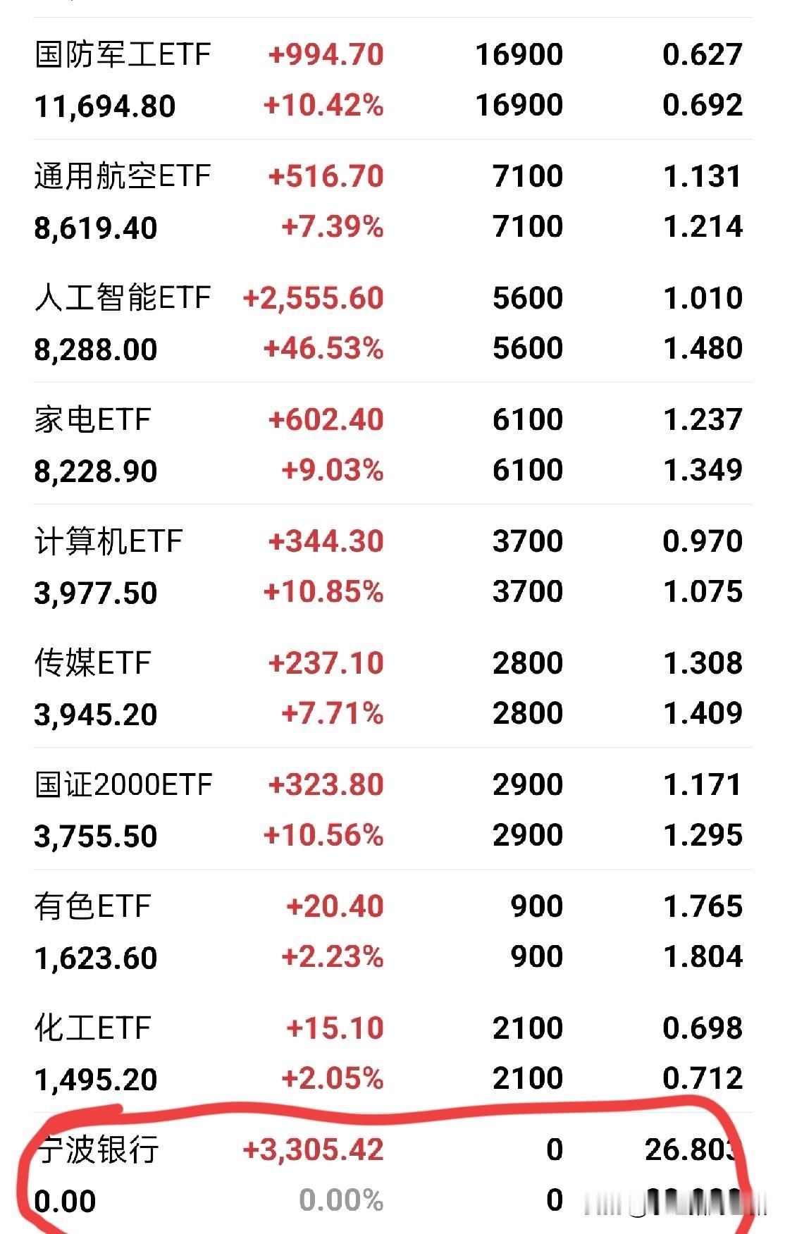 昨天把一个半月前,我所说的让家人建立的嘲讽型宁波银行仓位全部给清空了。当时下跌过程中陆续陆续买,成本大概是26.8元吧。然后过了28.8陆续开始抛,到今天为止全部抛完。因为是嘲讽仓位,所以就建了1500股,一个半月的全部盈利差不多3300元吧。 宁波银行确实依然是一家优秀的上市公司,一家优秀的银行,当然抛出的理由是我依然认为目前25~30元是合理估值,三季报发布后可能可以适度上调到26~31元区间,由于这两天科技下跌资金避险,银行股已经有一定涨幅,同时宁波银行也已经把三季报的好因素基本给交易了,就把这一个半月8%左右的收益装入口袋,让老人直接看到盈利,心情的爽度是完全不一样的[笑哭]。 不要嘲笑我资金少,首先这是家人的账户,其次这是从市值由大到小的排序(截图是最尾部部分),同步我也公布了一些让家人逐步开始建仓的ETF品种,基本都是每月分批买点,且都已经有盈利了,大家可以看看。