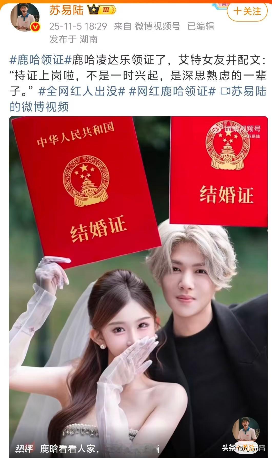 刚刷到“鹿晗结婚”吓我一跳,点开一看竟是鹿哈!这回真不是段子,ESO的“鹿哈”真领证了,还改名叫凌达乐,配文“持证上岗,是一辈子的决定”。曾经全网笑他蹭鹿晗热度,叫他“山寨男团”,可人家没躲,反而一步步把梗活成了人生。现在他结婚了,没搞大阵仗,就一句朴实话,却比多少明星官宣都走心。我们总盯着顶流什么时候恋爱,却忘了普通人也在认真活着。他不是鹿晗,但他有资格幸福。别再用“山寨”嘲笑谁,敢负责、敢成家的人,都值得一句祝福。点赞的,一起祝他新婚快乐!