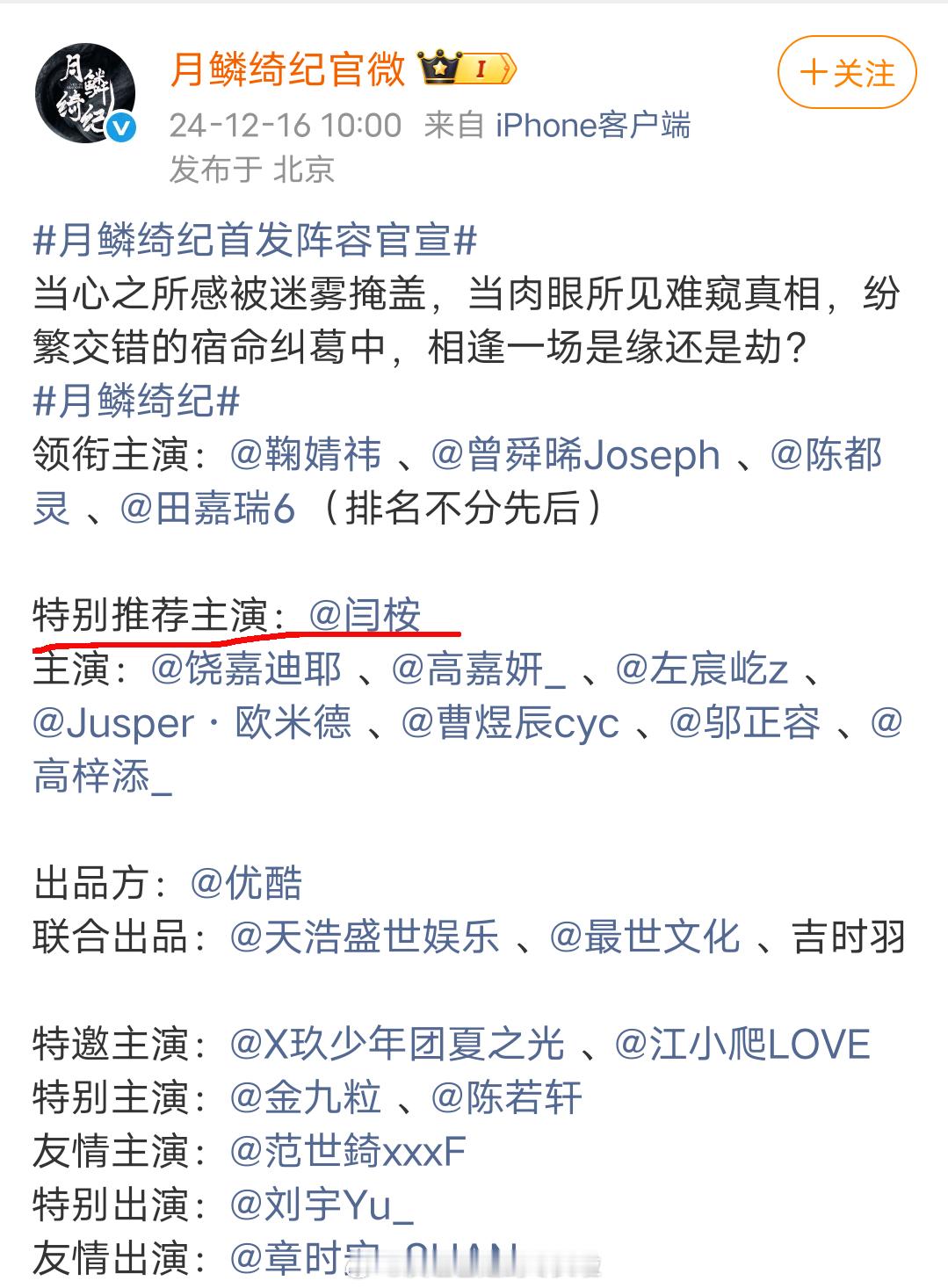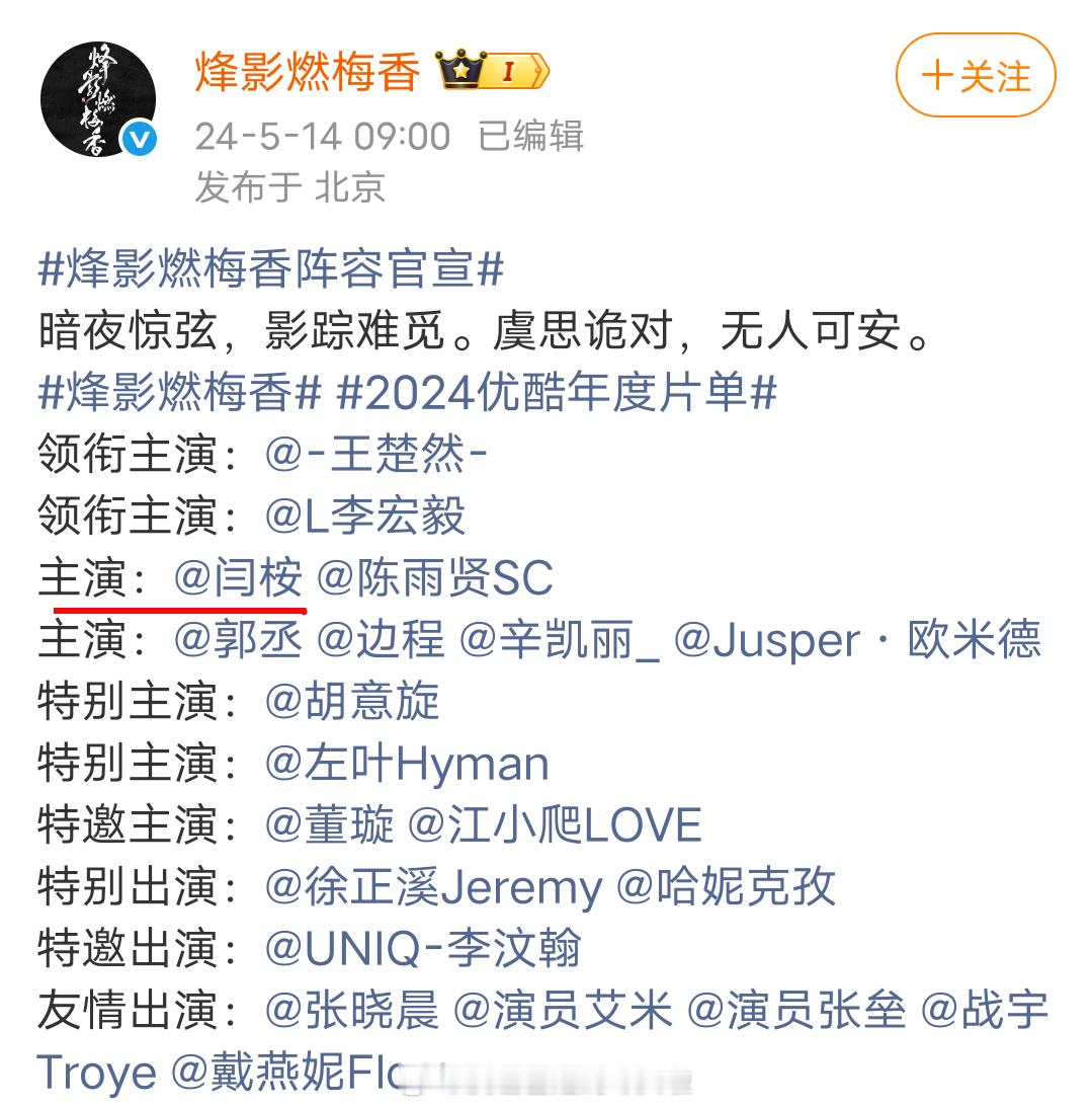 闫桉这个上位速度也太快了吧,第一部男主剧就搭上了爆剧班底,雁回时导演+延禧攻略编剧,女主还是田曦薇。