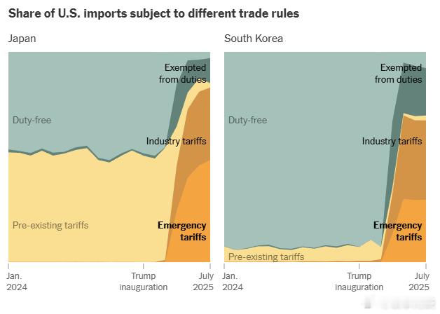 日本对美国出口的商品中,近三分之一受到汽车关税的影响,这些关税最初设定为25%,后来通过贸易协定降低到了15%。韩国也受到汽车关税的严重影响,并且似乎即将达成类似的协议。