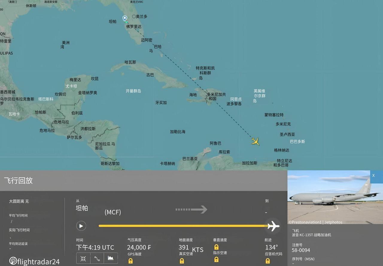 美国空军KC - 135T同温层加油机目前正在加勒比海海域活动,距离委内瑞拉的拉奥奇拉岛仅100英里。