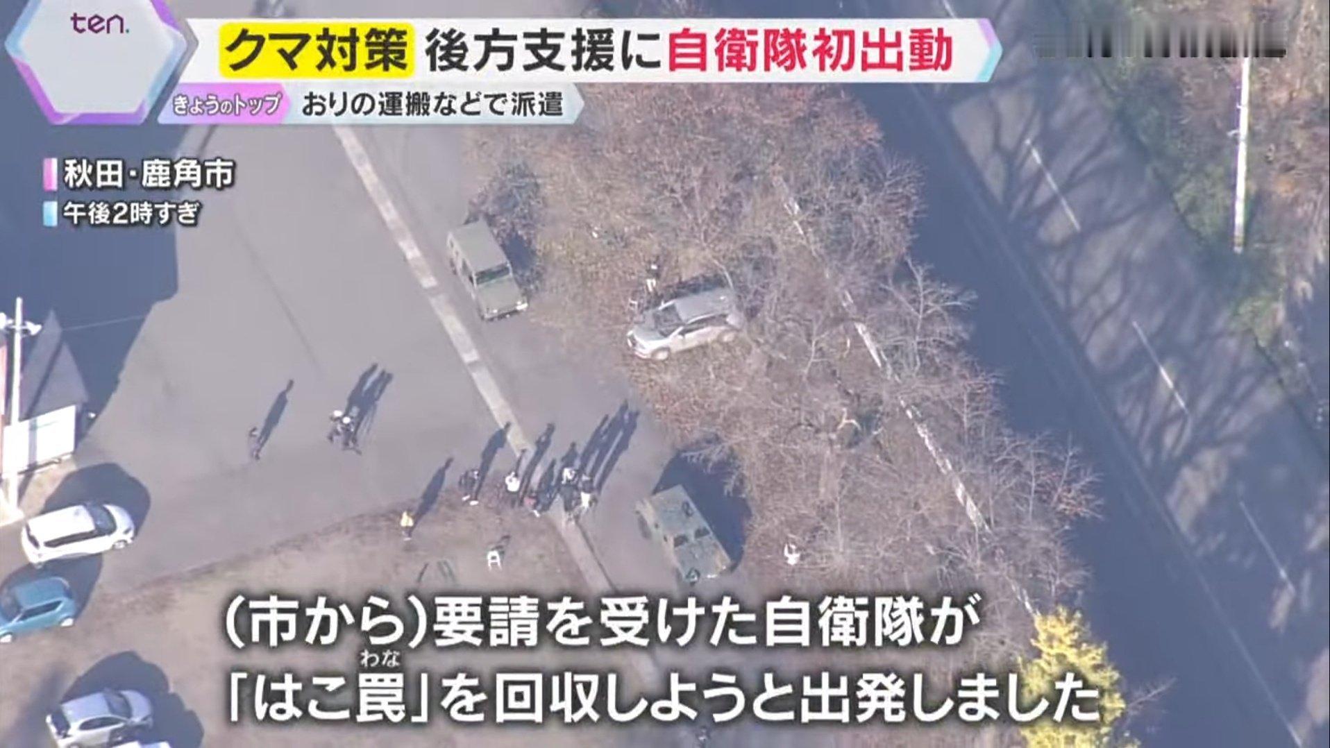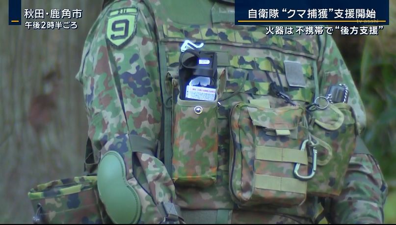 从昨天起日本陆上自卫队第9师团被派往秋田县执行捕熊任务,今年日本已经至少有五人被熊咬死,不过自卫队并非执行猎熊任务,而是负责支援猎友会的后方工作(运送与安装捕熊用的铁笼)。自卫队不会携带枪械,不过每名队员都配备了「防熊喷雾」「防护盾」「木枪」「网枪」等装备,并穿着内置防弹板的防弹背心。