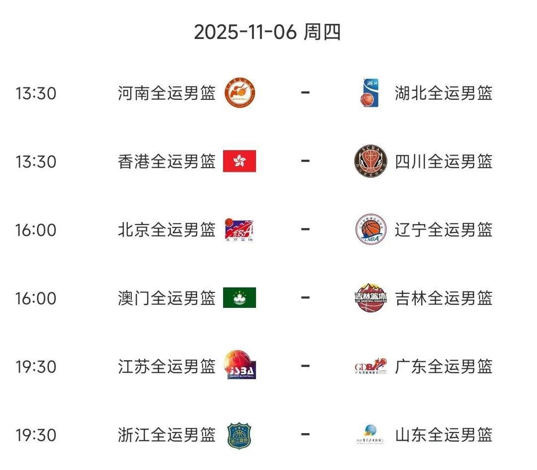 全运会男篮今日赛程安排,辽粤出战! 根据最新赛程安排,全运会男篮今日共有6场比赛,具体如下: 第一场,河南对阵湖北 第二场,香港对阵四川 第三场,北京对阵辽宁 第四场,澳门对阵吉林 第五场,江苏对阵广东 第六场,浙江对阵山东 目前各小组积分情况 第一组第一名,辽宁 第二组第一名,浙江 第三组第一名,四川