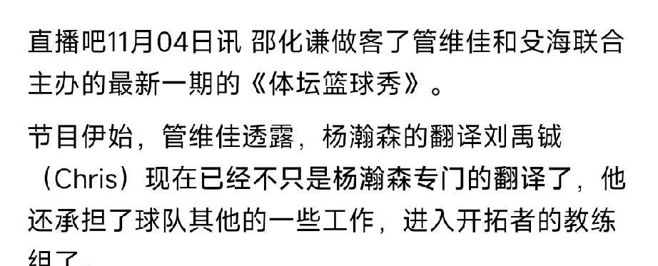 杨瀚森的翻译已经进入教练组了! 最新消息,杨瀚森的随身翻译已经进入教练组,不再是杨瀚森的专属翻译,他还承担了一部分教练组的工作! 这个消息一出来,很多球迷表示,最后杨瀚森没留在开拓者,而翻译留下来了!那就搞笑了! 说实话,杨瀚森虽然打的不是太好,但是在斯普利特的手底下是不可能好,他喜欢打小阵容,经常用格兰特打5号位,克林很的上场时间都被大大压缩。 杨瀚森目前只有在训练营表现出色,才能够争取更多的上场时间!