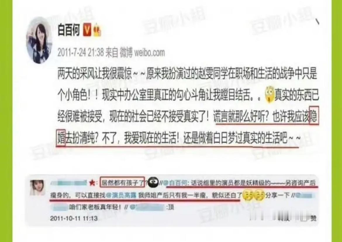 白百何发那条微博时,大概忘了十四年前对高露做过的事。 她怎么也不会想到,自己在东京电影节暗讽奖项不公,会让网友翻出2011年的旧账。当时高露凭栗子姐一角拿了最佳新人奖,事业刚有起色。 白百何却在微博爆料高露隐婚生子,还暗示隐婚扮清纯。高露当时二十多岁,正需要角色机会。这事之后,她的片约明显少了。 这么多年过去,白百何还是习惯不点名地说话,让网友去猜。高露则默默拍戏,从林小娘到吴非,用角色慢慢走回来。