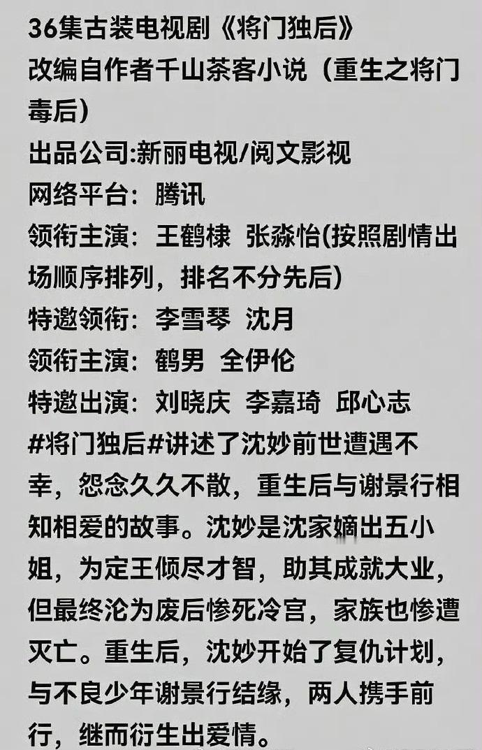 《将门毒后》不仅确定一月底开机,网传演员阵容也引发广泛讨论,优质 IP 的影视化进程总能唤起不少观众期待。将门毒后1月底开机将门毒后明年1月将开机将门毒后网传演员阵容 ​​​