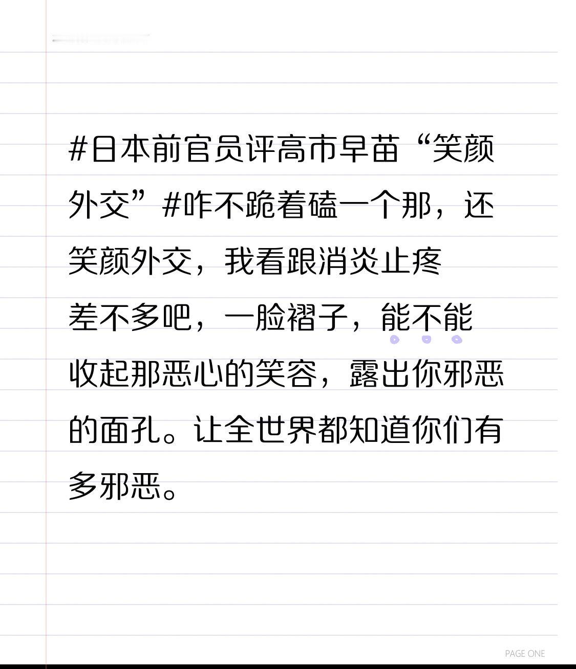 咋不跪着磕一个那,还笑颜外交,我看跟消炎止疼差不多吧,一脸褶子,能不能收起那恶心的笑容,露出你邪恶的面孔。让全世界都知道你们有多邪恶。