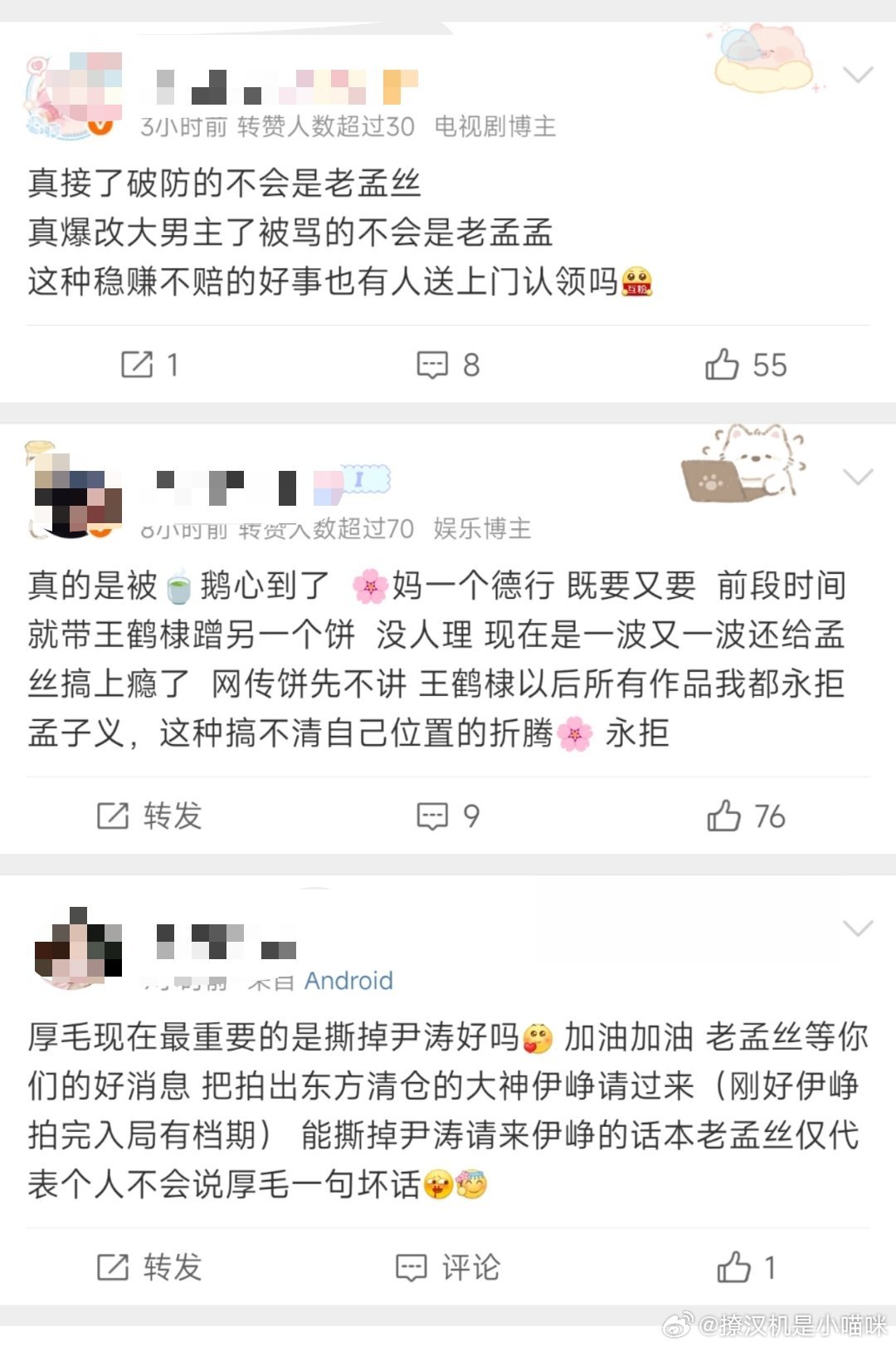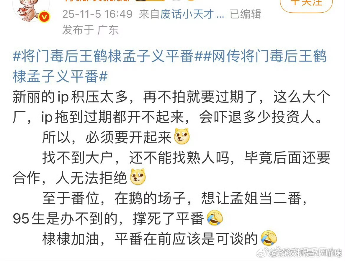 《将门毒后》王鹤棣,孟子义两家对接差不多同时确认接了,目前传的是平番,孟粉应该没啥意见,但是河堤丝不太接受平番的亚子,觉得真的平番,河堤白混了。
