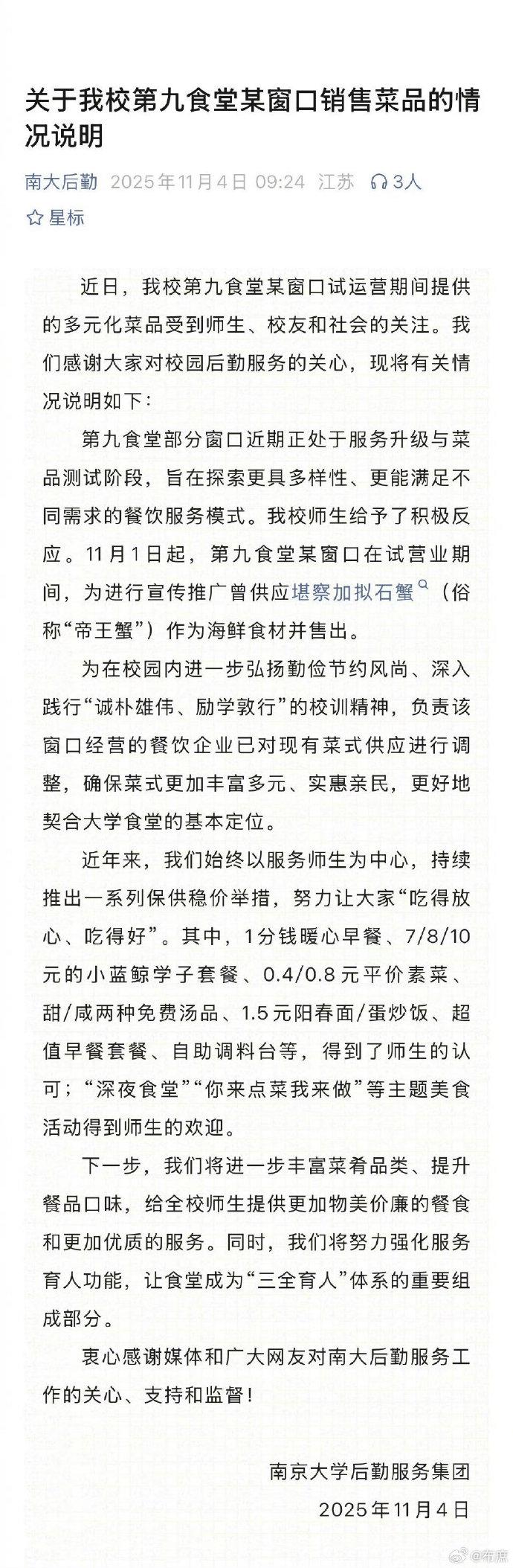 结果,南大更牛,直言帝王蟹餐是为丰富食堂菜品,满足不同的需求。 关键是,师生给予了积极反应。 我想问问南大,有多少学生能在校食堂点一份999元的帝王蟹餐? 死不认错的背后,肯定是死不改正。 南大,果然是牛。