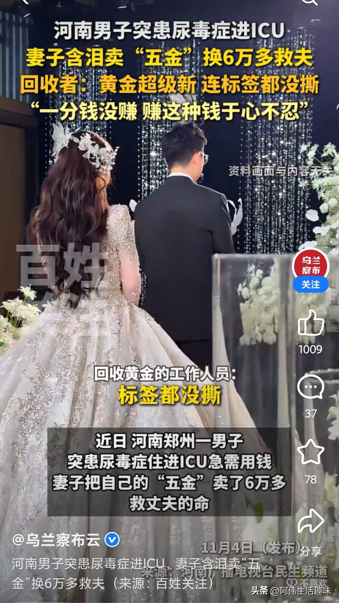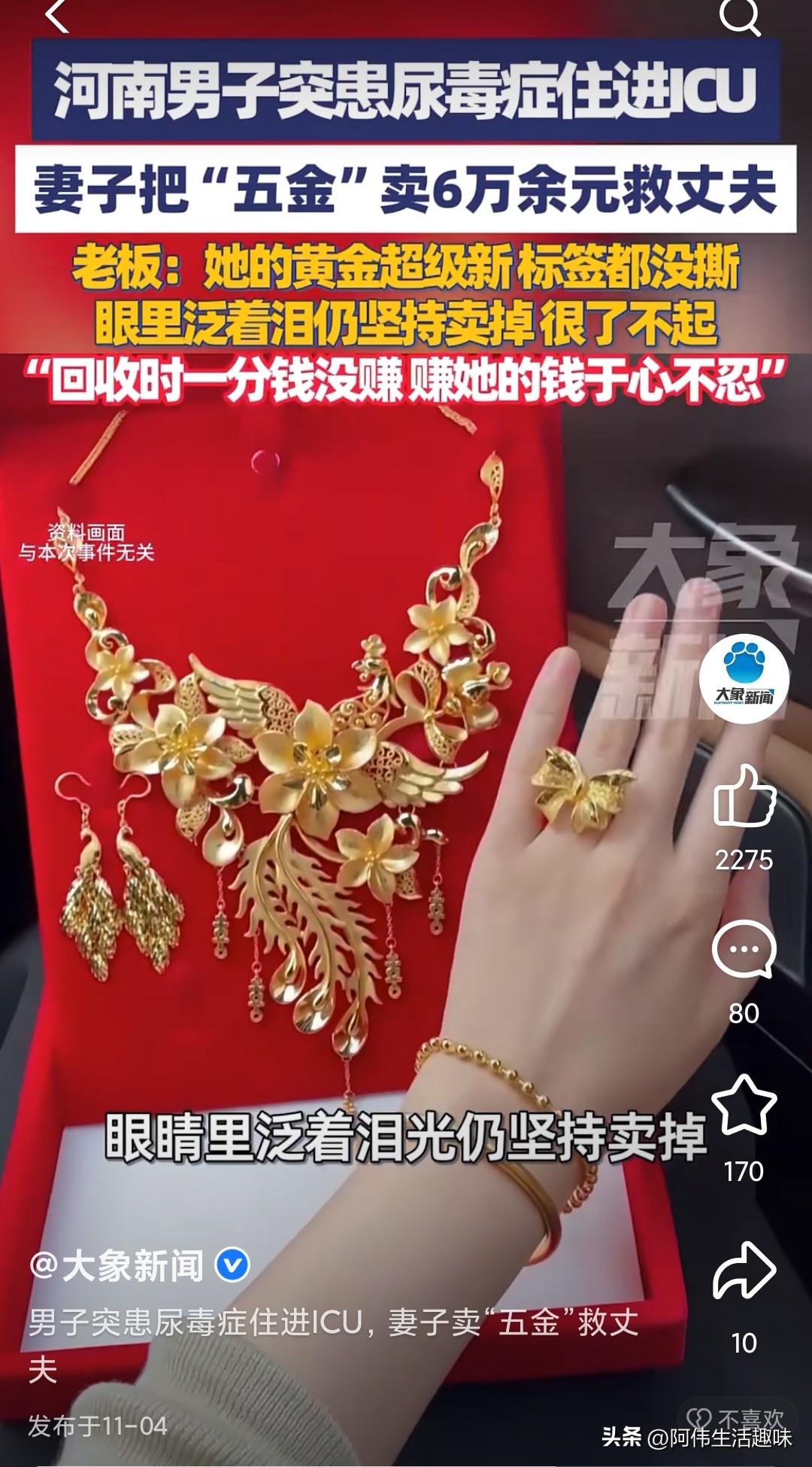 男子突患尿毒症住进ICU,妻子二话没说卖掉结婚的五金,换到6万多救丈夫,网友热议:这就是结婚成家的意义! 据大象新闻报道,河南郑州一男子突然患了尿毒症住进ICU急需用钱治病,他妻子连忙把结婚的“五金”送到黄金首饰回收店,回收店的工作人员看到连标签没剪还全新着的“五金”,询问了解后再三确认,男子妻子眼里含着泪光,虽不舍得但想到丈夫躺在病床急需用钱救治,依然语气坚定要卖掉。工作人员也被感动到了,没赚任何手续费给她这些“五金”换了六万多。 事情被大象新闻采访报道后,有网友说又相信爱情了。 妻子的行为尽到了结婚誓词的责任,家里顶梁柱倒下了,共患难同甘苦,她没抛弃这个家,很是让人感动。 首饰店工作人员的做法也值得称赞! 这不就是结婚成家最终的意义吗?