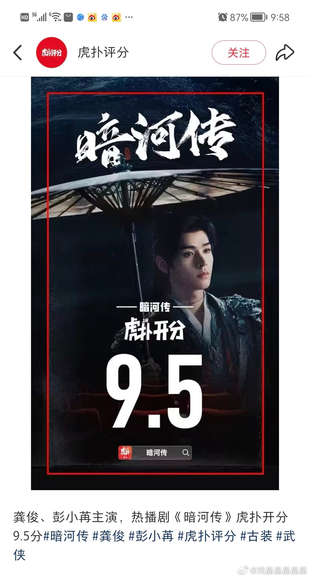 《暗河传》虎扑开分9.5,虎扑男看过少歌系列的肯定也会喜欢暗河传,剧情,打戏,特效,演技,服化道都超级棒!不仅主角出彩,配角也出彩,每一集都舍不得快进的程度,甚至每一场打戏都要倒回去反复观看很多遍,真视觉盛宴!