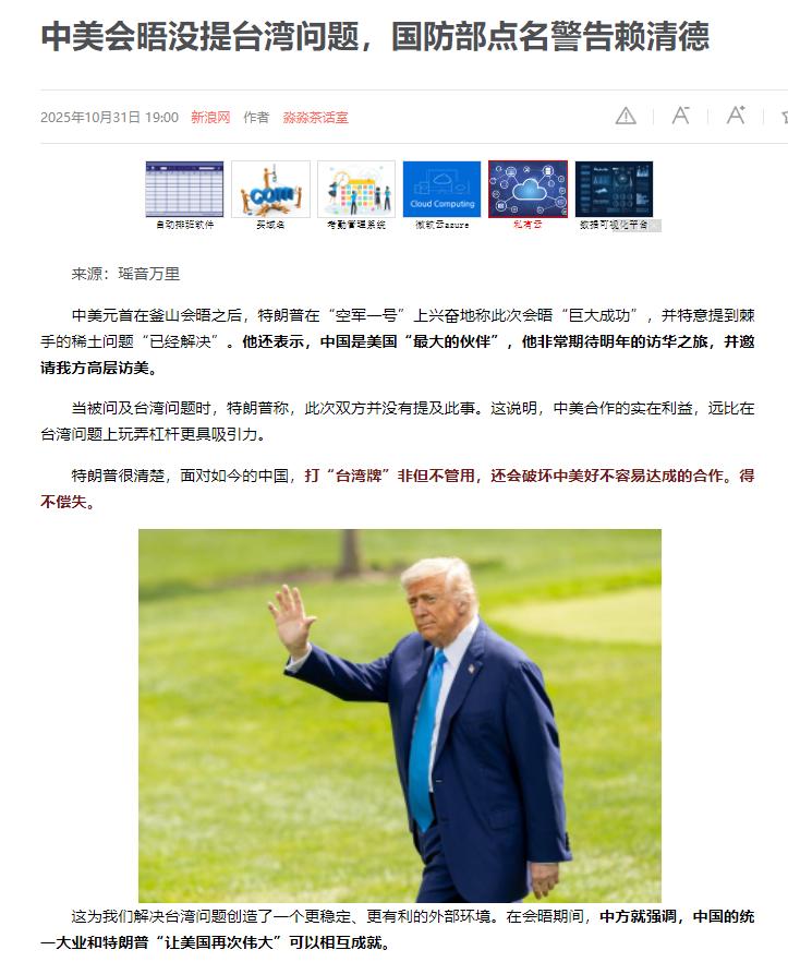 美媒表示中国明显在进行布局!11月5日,根据华尔街日报报道,美媒表示,与特朗普会晤时,中方为何对台湾只字不提?这明显不是偶然。 中国最重要的红线,也就是台湾问题。 而中国的官方通稿呢?却只字未提。 这对于任何关注中美关系的人来说,这种回避方式都太显眼。 即便是对本届美国政府而言,这无疑也是一个急剧的转变。 台湾问题作为中国核心利益中的核心,以往几乎是每次中美会晤的必谈议题,但这次中方通稿的“留白”,恰恰反映出北京对台海局势的主导权已经稳固到无需在每次会谈中反复重申的地步。 这种战略自信首先来源于中美实力对比的历史性变化。 根据近期中美经贸博弈的结果来看,特朗普政府此前主导的对华关税战,在持续半年后以美方的实质性让步告一段落:美方不仅取消了以芬太尼为借口加征的10%关税,还暂停了出口管制“50%穿透性规则”,并在最具争议的海事、物流和造船业301调查上按下暂停键。 甚至在会晤期间,特朗普一改往日强势姿态,提前站在中美国旗前等候,主动握手,会后还做出“请”的手势礼让中方先行。 这种外交细节背后,是经济数据的硬支撑——尽管有关税战,中国对美出口的稀土、电子产品等关键商品不仅未萎缩,反而逆势增长,每天仍有约10亿美元中国商品运往美国。 当美国在贸易领域不得不向现实低头时,中国在台湾问题上的战略耐心自然更加充足。 更深层的战略考量在于,中国正在将台湾问题从“中美博弈的焦点”转化为“消耗美国战略资源的泥潭”。 美国智库大西洋理事会在其报告《加强台湾韧性》中一针见血地指出:中国并非无力武统,而是有意将台湾问题作为牵制美国的长期战略杠杆。 美国每年需要对台军售数十亿美元,2024年批准80亿美元军售,2025年又追加10亿美元爱国者导弹系统升级,同时在印太地区投入巨资进行军事部署。 这些真金白银的投入,实际上绑架了美国的战略资源,使其在台海陷入长期消耗,从而削弱了美国在中东、欧洲等其他战略方向的投入能力。 中国以静制动,看着美国主动背上这个战略包袱,正如一位美国专家所言:“只要我们不动手,美国就只能一直扛着这个压力,时间久了,谁耗得过谁可就不好说了。” 中国的战略定力还来源于对“经济融合”比“军事对抗”更有效的清醒认知。 台湾经济对大陆的依赖度持续加深,其出口总额的四成以上面向大陆市场,半导体产业对大陆的依赖度高达三成。 截至2024年,大陆对台投资已占对外投资总额的10%,这种“你中有我、我中有你”的经济格局,使得“台独”势力任何冒险行为都可能触发自身经济命脉的断裂。 中国通过惠台政策吸引台湾青年来大陆学习、工作、创业,2023年就有10万台湾游客来到大陆。 这种渐进式的融合策略,犹如温火慢炖,比急火猛攻更能从根本上瓦解“台独”的社会基础。 在军事层面,中国的“沉默”恰恰反映了其“行动优于言辞”的战略风格。 2022年8月佩洛西窜访台湾后,解放军在台海举行的大规模军演,实现了对台湾海峡事实上的控制权突破。 近年来,中国海军航母从辽宁号、山东号到福建号相继服役,055型驱逐舰、076两栖攻击舰等专为海峡作战设计的装备陆续列装,火箭军和空军新型装备形成体系化战斗力。 这些军事建设不是为了表演给外界看,而是实实在在地构建了区域拒止能力。 正如美国哥伦比亚大学专家安德鲁·内森分析,中国从俄罗斯在乌克兰的教训中汲取了经验,不愿陷入一场被外部势力拖入长期消耗的冲突。 中国更倾向于通过常态化的战备巡逻和军事演习,一步步落实对台湾海峡的实际控制。 值得注意的是,中国对台策略的转变也与应对美国政治周期的需要高度相关。 特朗普政府上任后,对外政策呈现出明显的战略收缩倾向,其2025年《国防战略》草案将本土防御和西半球安全任务的优先级提升至大国竞争之上。 与此同时,特朗普政府在全球范围内挥舞关税大棒,不仅对中国,也对墨西哥、加拿大、欧盟等征收高额“对等关税”,导致美国与传统盟友关系紧张。 这种内顾倾向和单边主义行为,客观上削弱了美国协调盟友干预台海事务的能力。 中国此时在台湾问题上的“战略静默”,既是避免给美国提供集结反华势力的借口,也是等待美国自身影响力进一步衰减的战略耐心。 事实上,中国前驻美大使崔天凯早已点明战略底线:“我们不会掉入有些人给我们设下的陷阱...导致中国人杀中国人。” 中国不会按照美国设定的剧本行事,不会让台湾问题成为外国削弱中国的代理人战争。 美媒将中国的战略定力误解为“避战”或“能力不济”,恰恰暴露了其对中国战略文化的误读。 中国追求的不是战术上的口舌之快,而是战略上的实质推进。 当美媒还在纠结于会谈通稿中是否出现“台湾”二字时,中国已经通过踏平海峡中线、强化实际控制等一系列行动,将统一的大势牢牢掌握在自己手中。 这种“多做少说”的策略,正是中国古老智慧“大音希声,大象无形”在现代国际博弈中的生动体现。
