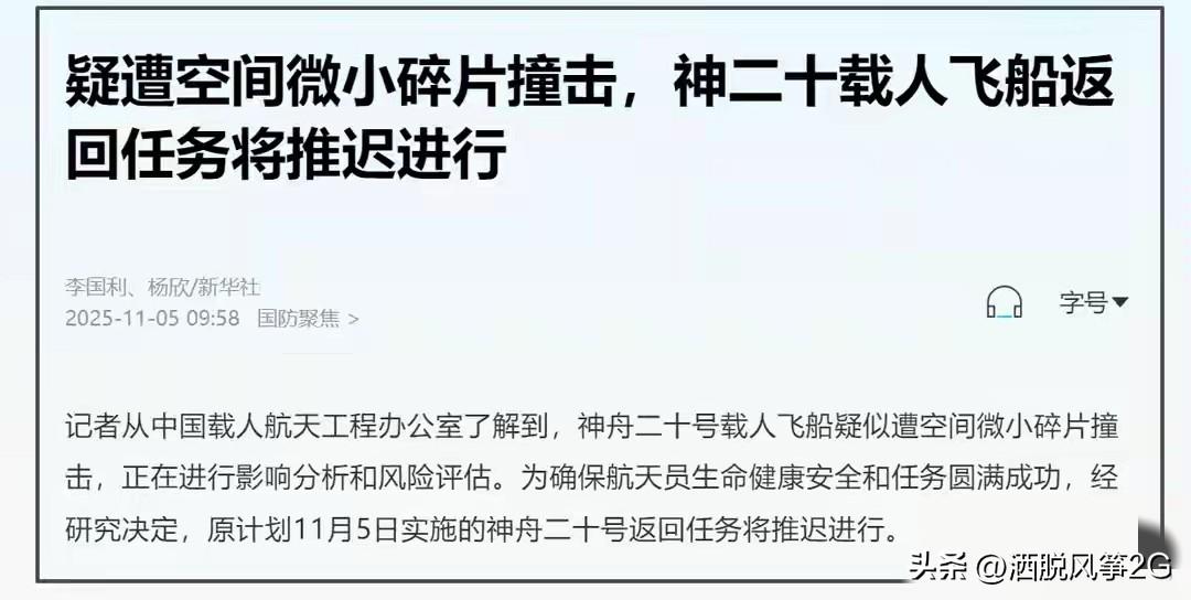 太空碎片威胁升级,神舟二十号飞船遭撞击,6名航天员能否长驻? 11月5日,中国载人航天工程办公室的紧急通报让无数国人揪心——原定当天返回的神舟二十号,因在轨遭遇空间微小碎片撞击,返回任务临时推迟。此时天宫空间站正处于“三舱三船”构型,神舟二十号与二十一号乘组共6名航天员同时在轨,他们的安全、任务的推进,瞬间成了全网焦点。谁能想到,看似空旷的太空,早已布满了致命隐患。 撞击神舟二十号的碎片,直径可能仅几毫米,却有着毁天灭地的威力。在400公里高度的近地轨道,这类碎片的飞行速度能达到每秒7-10公里,1克重的碎片撞击能量就相当于30克TNT炸药,堪比一颗手榴弹。更揪心的是,这类微小碎片根本无法被地面雷达精准捕捉,航天器只能靠自身防护硬扛。而神舟二十号采用的径向对接方式,暴露面积更大,缺乏其他舱段遮挡,遭遇撞击的概率本就比轴向对接高出不少。 但6名航天员没有慌,这份镇定源自无数次的预案演练和中国航天早已织就的安全网。神舟二十号乘组在轨180多天里,先后7次出舱执行防护加固任务,给空间站关键部位加装“复合装甲”——这种由纤维和金属制成的防护层,重量轻却能抵御1厘米级碎片撞击。撞击发生时,指令长第一时间启动三级应急响应,与地面团队协同稳定飞船姿态;天宫空间站的10.2米长机械臂迅速展开,携带高清摄像头对飞船进行360度环绕检查,重点排查返回舱热防护层和推进系统,任何微小损伤都逃不过它的“眼睛”。 这不是中国空间站第一次遭遇碎片威胁。2023年底,天和核心舱的太阳能电池就曾被碎片撞击,汤洪波、唐胜杰乘组耗时7个多小时出舱修复;2024年3月,另一组航天员再次出舱处理电力系统损伤。一次次实战考验,让中国航天积累了丰富的应急处置经验,也让防护体系不断升级——如今空间站的撞击泄漏监测系统,能在0.1秒内定位2毫米以上的穿孔,配合压力应急处置设备,航天员的故障应对时间提升了5倍。 可太空环境的恶化速度,比防护技术的迭代更紧迫。截至2025年初,地球轨道上直径大于10厘米的可追踪碎片已超3.65万个,1至10厘米的致命碎片过百万,毫米级碎片更是高达1.3亿个。这些碎片大多来自报废卫星、火箭残骸,而近年全球巨型星座的加速部署,让近地轨道变得拥挤不堪——仅SpaceX的“星链”计划就已部署近万颗卫星,曾两次逼近中国空间站,迫使我方紧急避碰。更危险的是“凯斯勒效应”的隐患:一旦碎片密度突破临界值,一次碰撞就会引发连锁反应,让近地轨道在百年内无法安全使用。 为什么太空碎片治理这么难?关键在于责任划分模糊和治理成本高昂。欧洲的“清洁太空”计划,单次碎片清除成本高达5000万美元,远超多数卫星价值;美国、俄罗斯虽有技术,却缺乏全球协同的意愿。而中国不仅在被动防护上发力,更在主动治理上突破——实践二十五号卫星通过在轨加油技术让失效卫星延寿,减少潜在垃圾;天基激光清除系统也已完成在轨测试,能让微小碎片减速坠入大气层烧毁。 回到核心问题:6名航天员能否长驻?答案藏在技术底气和制度准备里。地面有天地一体化监测网络,能提前72小时预警碰撞风险;舱内有完善的应急设备,航天员处置故障的能力不断提升;酒泉卫星发射中心常年有神舟飞船应急值班,可在几天内发射救援。这次神舟二十号的撞击,虽然推迟了返回,却也验证了防护系统和应急流程的可靠性——24小时内,地面团队就完成了轨道演算和损伤评估,确认“具备返回条件”。 太空探索从来没有绝对的安全,碎片威胁是全人类的共同挑战。但中国航天用一次次实战证明,只要把风险想在前、把预案做足,就能在未知危险中守护航天员的安全。6名航天员的长期驻留,不仅是中国载人航天的目标,更倒逼全球加速空间治理的协作。毕竟,太空是人类共同的家园,若任由碎片堆积,任何国家的航天梦都将无从谈起。 各位读者你们怎么看?欢迎在评论区讨论。