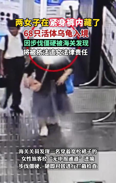 反华势力入侵?我国海关截查两名女子,发现她们裙下藏了68只生物。 10月21日报道,这俩人穿得挺宽松,长裙晃荡着,走起路来腿部总有点别扭,膝盖像是卡壳了似的,每迈一步都得缓一缓,眼神还老往检查台那边瞄。 那心虚劲儿,明眼人一看就不对劲!果不其然,一拦一查直接懵了:俩人贴身穿的黑紧身裤上,用松紧带、透明胶带缠满了小乌龟!一数整整 68 只,一个缠 39 只,一个缠 29 只,这得多遭罪? 俩大姐后来才说,是口岸有人搭茬,说帮着带点 “小玩意儿” 就给两三百港币,压根不知道带的是活龟,这不纯纯被当枪使了嘛! 其实这种事儿真不是头一回,这些带货的基本都是普通人,就图点小钱,根本不知道背后走私团伙多黑 —— 他们专挑这种 “工具人”,因为人体藏东西比行李夹带、邮件伪装难查多了,能躲开货物通道的严格检疫。 这些团伙在国外低成本抓点异宠,找个人带货过来,到国内 “异宠圈” 一卖,单只就能翻好几倍,68 只小乌龟黑市上能卖几十万,稳赚不赔,风险全甩给带货的和咱们的生态! 这些小乌龟看着巴掌大挺萌,其实是外来的侏儒侧颈龟,咱们本土没有,还在风险监测名录里。为啥走私的爱带它?一是小,好藏;二是现在不少人喜欢养 “小众宠物”,觉得显个性,愿意花大价钱买。 可你知道这玩意儿有多坑吗?它们适应力超强,还特能生,一旦跑到自然水域里,就跟本土的中华草龟、黄喉拟水龟抢食,本土龟根本干不过它们,时间长了本土龟可能就没活路了! 更吓人的是,这些外来龟还可能带病菌,要是扩散到水里,咱们玩水、钓鱼的时候,皮肤破了接触到,都可能生病,这可不是闹着玩的! 咱们早有规定,带外来物种入境必须审批,私自带就是违法!这些年我们一直盯着走私的,截了好多异宠,什么大蜥蜴、毒蝎子都有,还升级了智能设备,就为了堵住这些漏洞。 这次 68 只龟被截住,真是太幸运了!现在这些龟已经被隔离检查,俩大姐也交给相关部门处理了。 要是大家身边有人说 “帮我带点东西过海关,给你钱”,千万别答应,指不定带的啥;即便喜欢养宠物,也别买那些来路不明的外来货,不光可能违法,还等于帮走私团伙赚钱。 要是这些外来物种真流到咱们的河里、湖里,以后钓鱼钓不着本土鱼,游泳还得担心病菌,多糟心!海关守住了国门,普通人也得加点小心,别贪小便宜吃大亏,也别为了 “猎奇” 给生态添乱。 只有上上下下都留意着,那些想靠走私异宠搞破坏的,才没机会钻空子! (每天更新,欢迎关注,喜欢文章的可以帮忙点个赞留条评~) 对此大家有什么看法?