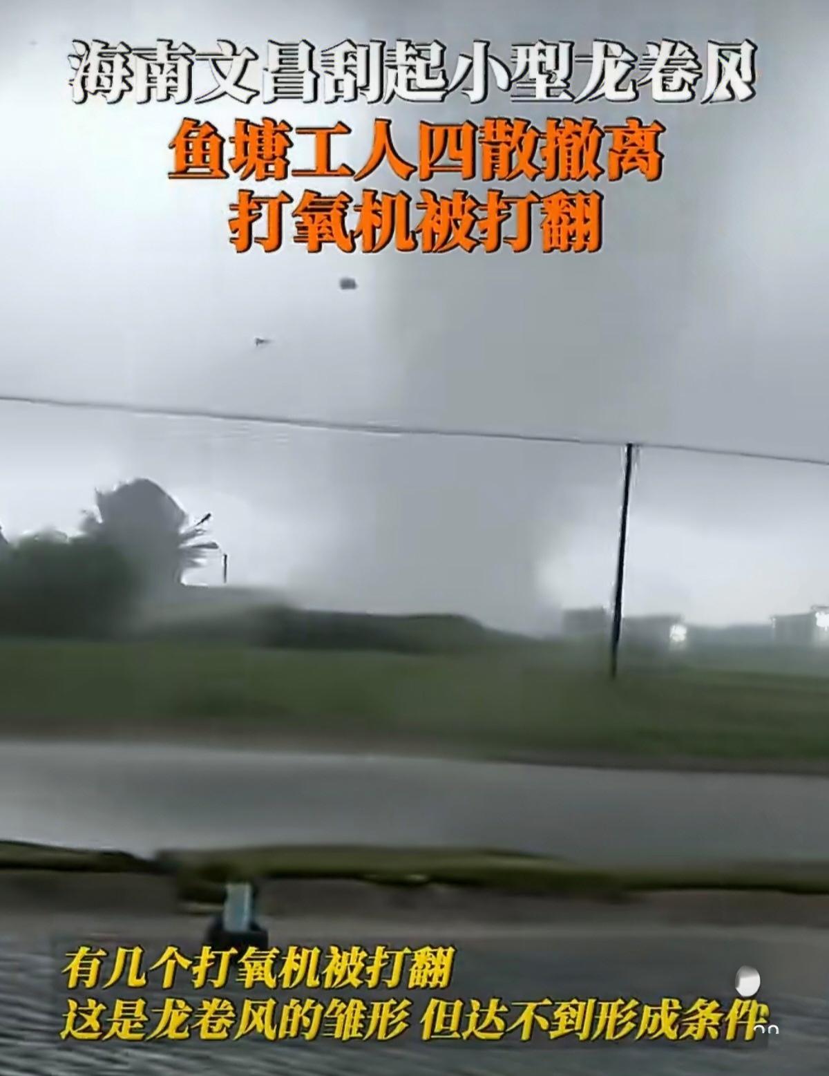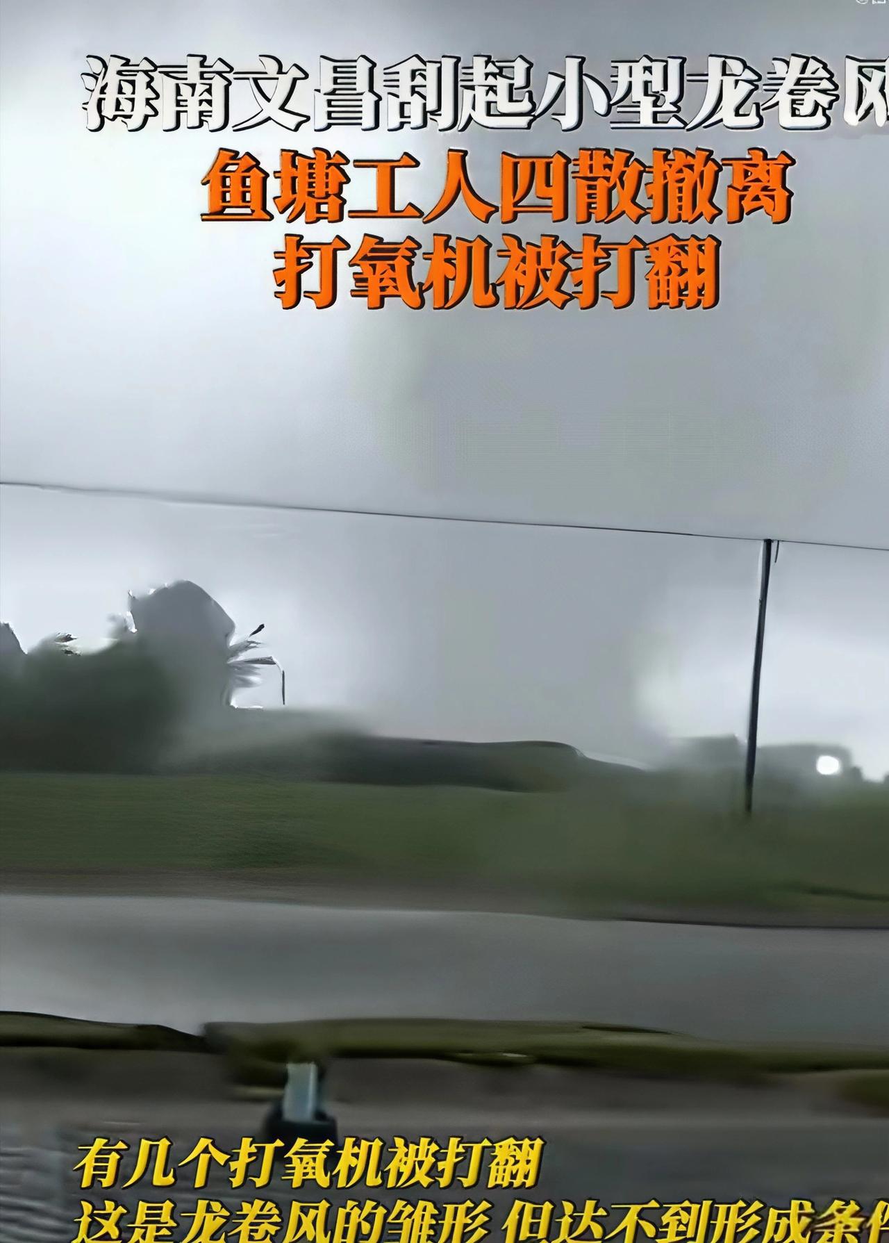海南文昌遭遇小型龙卷风 应急部门迅速勘察处置 11月4日,海南文昌出现小型龙卷风,鱼塘工作人员发现后迅速逃离。文昌市应急管理局工作人员回应称,此次龙卷风导致几个鱼塘打氧机被掀翻,目前工作人员已前往现场开展勘察工作。目前暂未收到人员伤亡报告,后续情况将持续跟进。龙卷风作为强对流天气,破坏力不可小觑,提醒群众需提高警惕,遇此类天气及时避险。