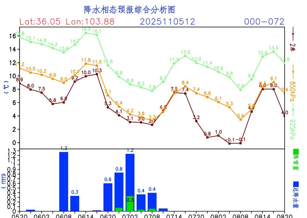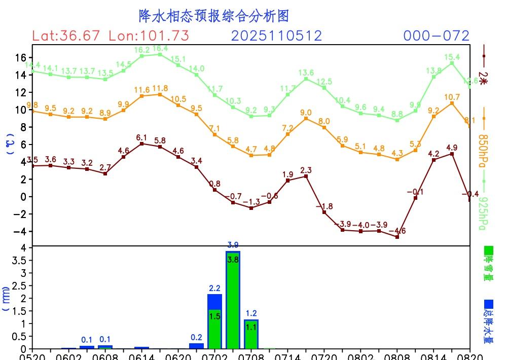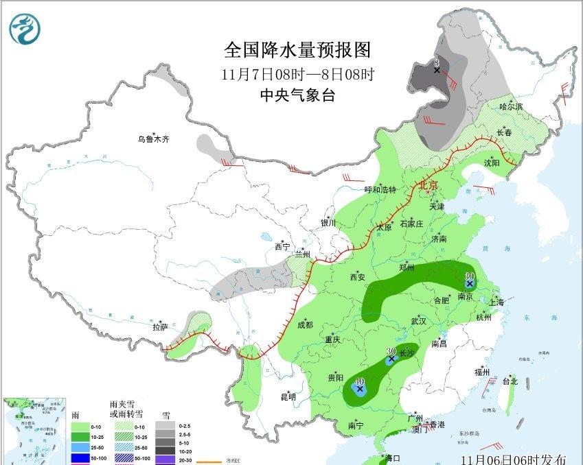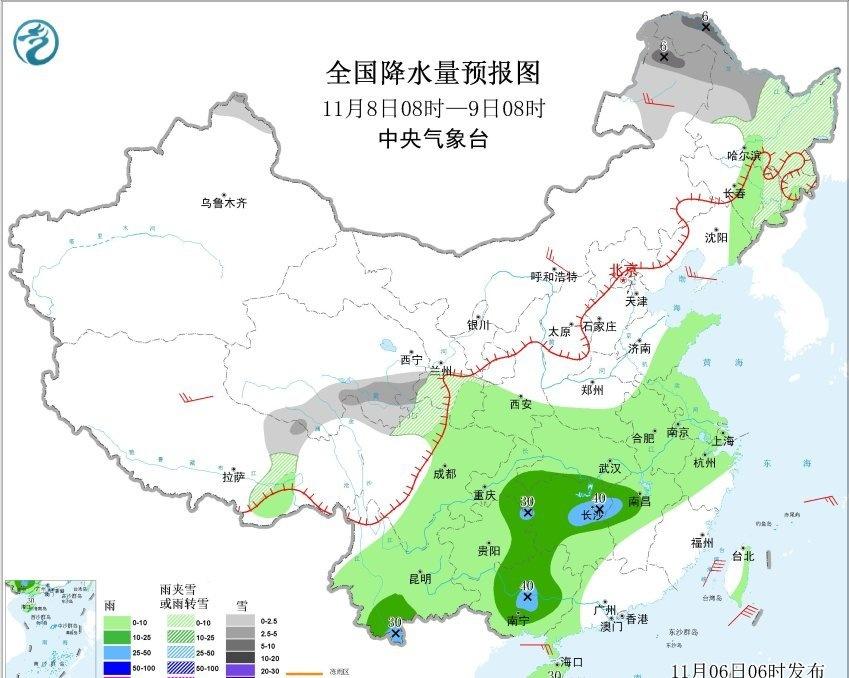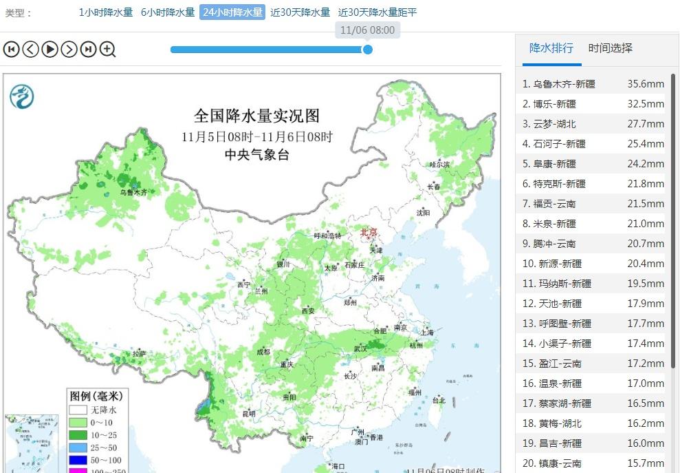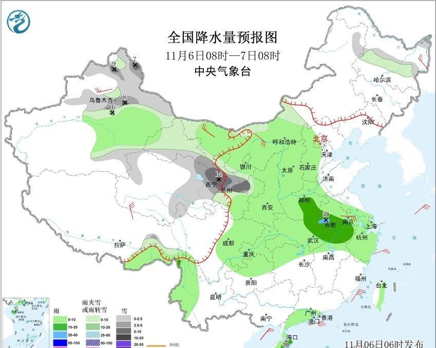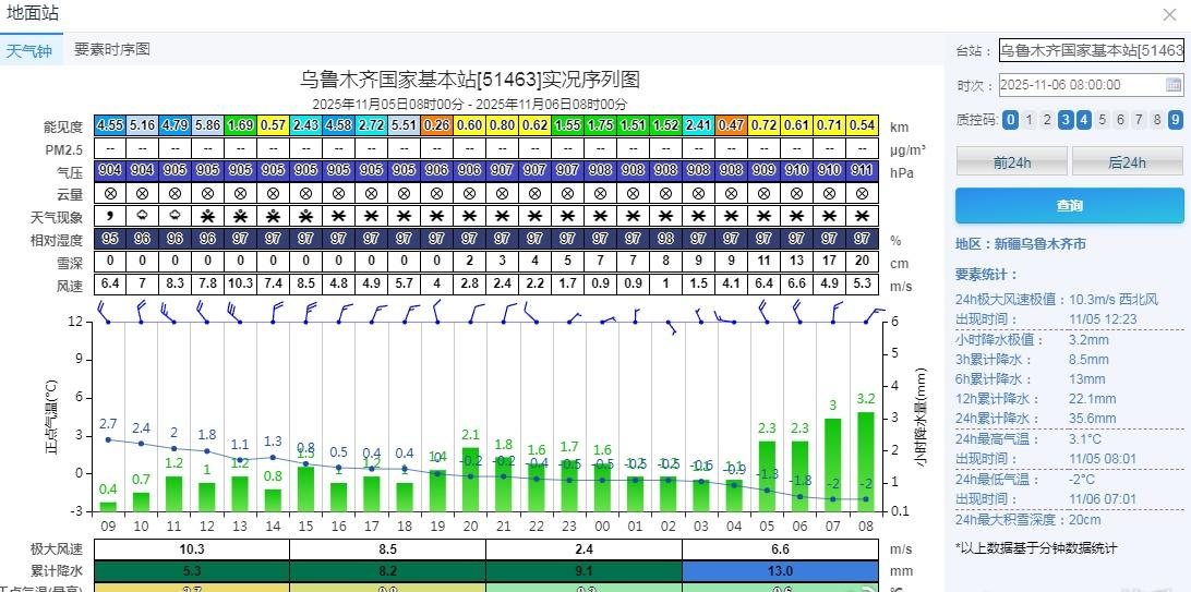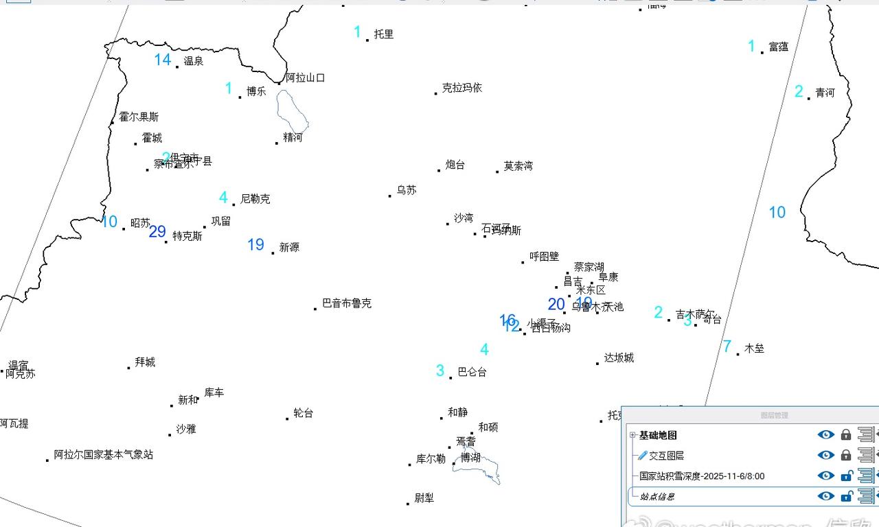 【强降雪——乌鲁木齐破纪录】昨天到今晨,新疆天山沿线出现强降雪,乌鲁木齐先雨后雪,16时以后为纯雪。24小时降水量35.6毫米,排名全国第一,并打破当地11月单日最强降水纪录。从逐小时累计看,纯雪量大于28毫米,今晨8时积雪20厘米。目前降雪还在持续,因此这次降雪应该能达到特大暴雪级别,也是当地11月最强降雪。 从今晨积雪实况看,特克斯29厘米、乌鲁木齐20厘米、天池19厘米、新源19厘米、小渠子16厘米、温泉14厘米。今天白天新疆天山沿线的降雪会逐渐减弱。未来随着高空槽东移,今明在青海东部将有明显降雪,西宁今夜-明晨将迎来初雪(图7),有望达到大雪级别。兰州7日凌晨也有可能出现雨夹雪(图8)。此外明后2天,地面还有气旋发展,内蒙古东部的降雪也会明显增多增强。