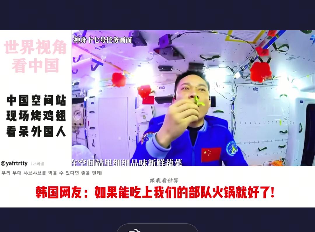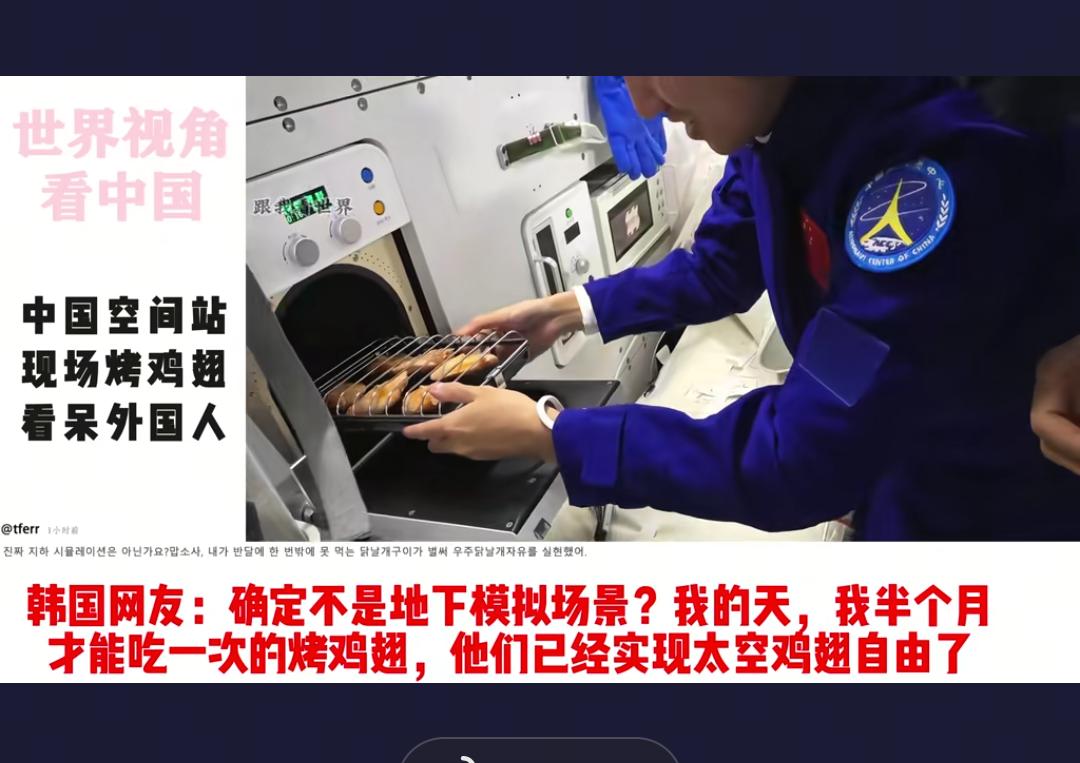 太炸裂了,当国际空间站的宇航员还在啃压缩饼干时,中国空间站的宇航员已经吃上了烧烤。这不仅仅是一次简单的烧烤,更是国力的体现。 中国此举震惊了世界,更引发他国网友的评论。大多都是羡慕,韩国网友发挥依然稳定“羡慕嫉妒恨”。有个韩国网友回复“如果空间站能吃到韩国的部队锅就更好了”,估计韩国这个想法无法实现,毕竟中国空间站整洁如新,没有垃圾桶啊!