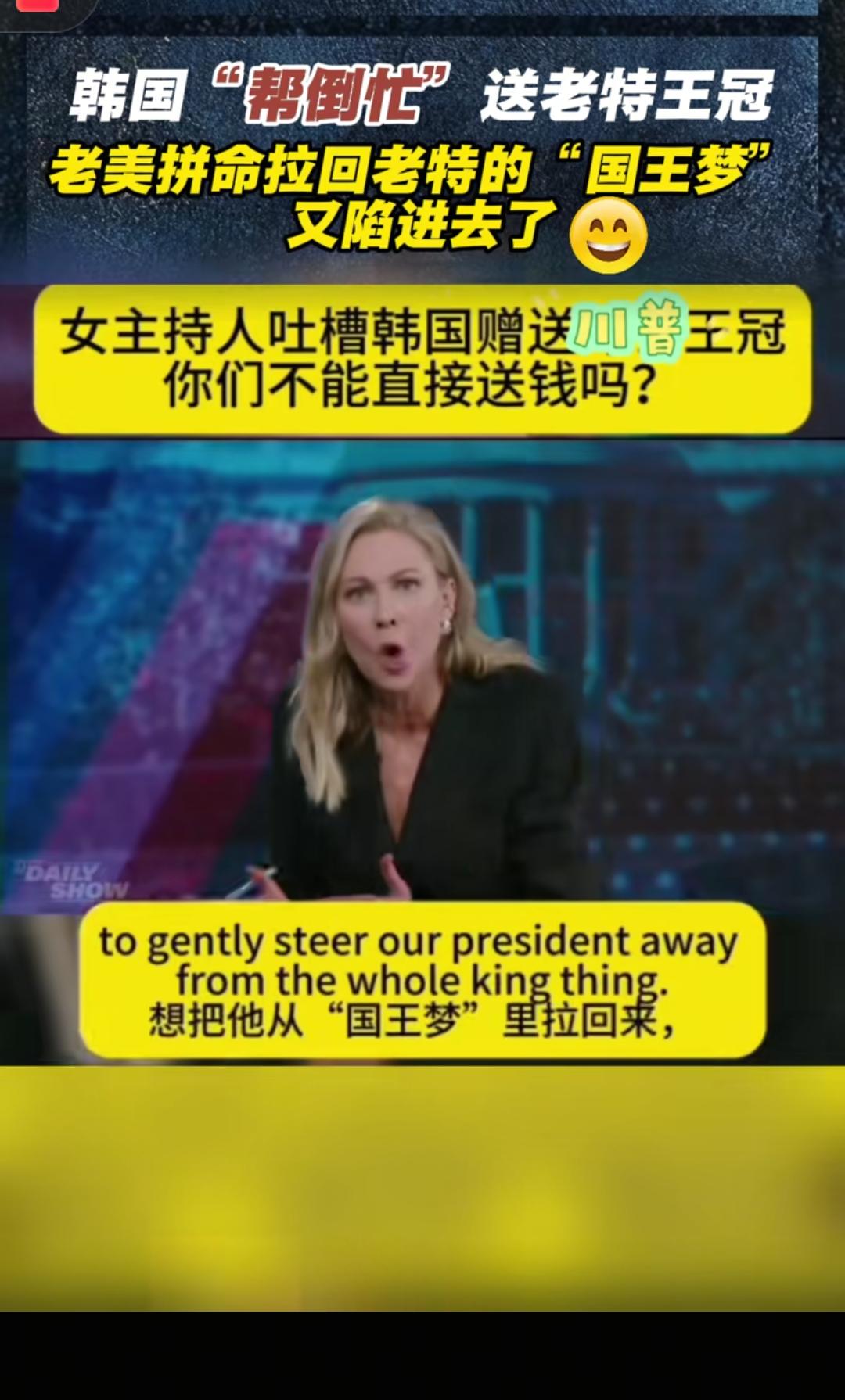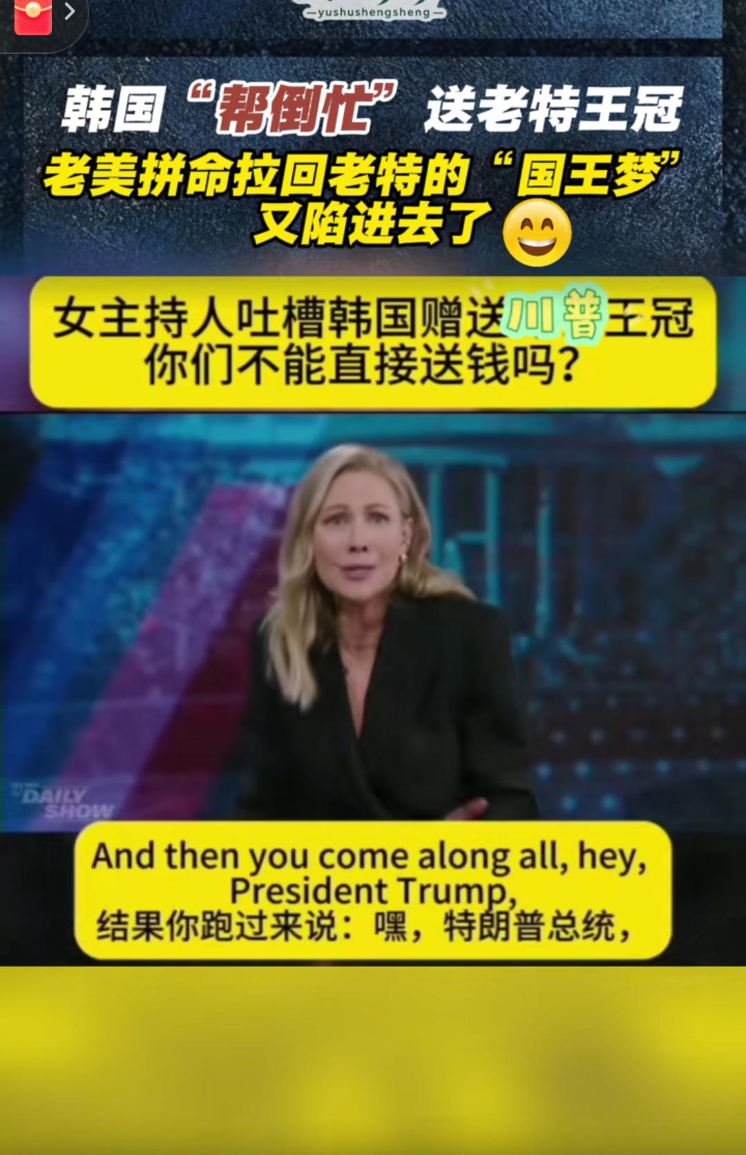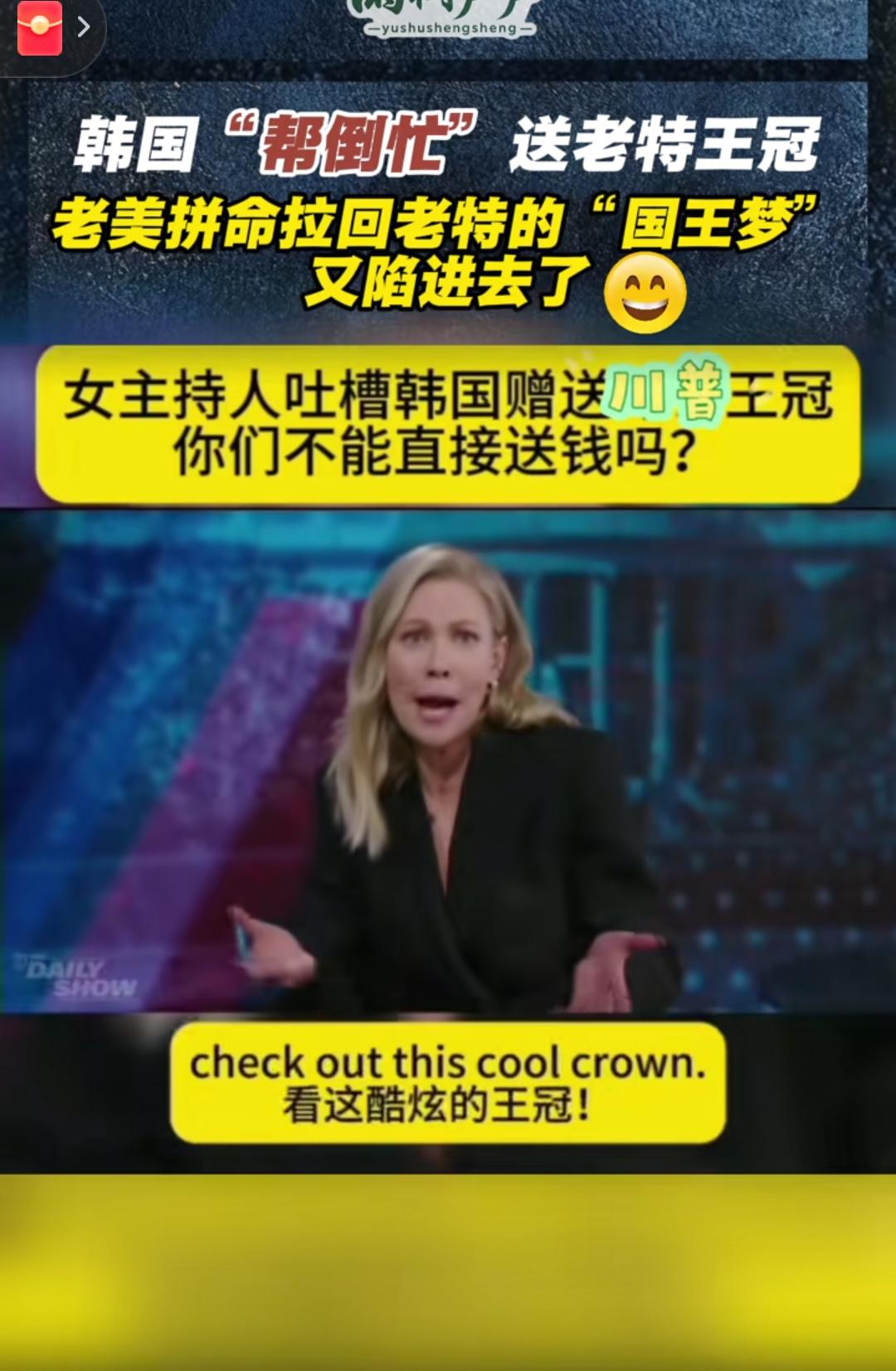 此前万斯制作出欧洲政要向特朗普跪拜的视频,如今李在明又送给特朗普新罗时期的“复制王冠”,这真的是把特朗普当成国王了吗? 美国女主持人调侃韩国人:“我们刚把特朗普从当国王的美梦中拉回现实,韩国人却跑过来跟特朗普说,看看这顶漂亮的王冠。” 更有外国人士评论道:“那个时期半岛是中国属国,送特朗普古代王冠,要是特朗普了解这段历史,不得气坏了。” 特朗普向韩国张嘴就要几千亿,韩国现在是尽最大努力哄着特朗普,供着特朗普。