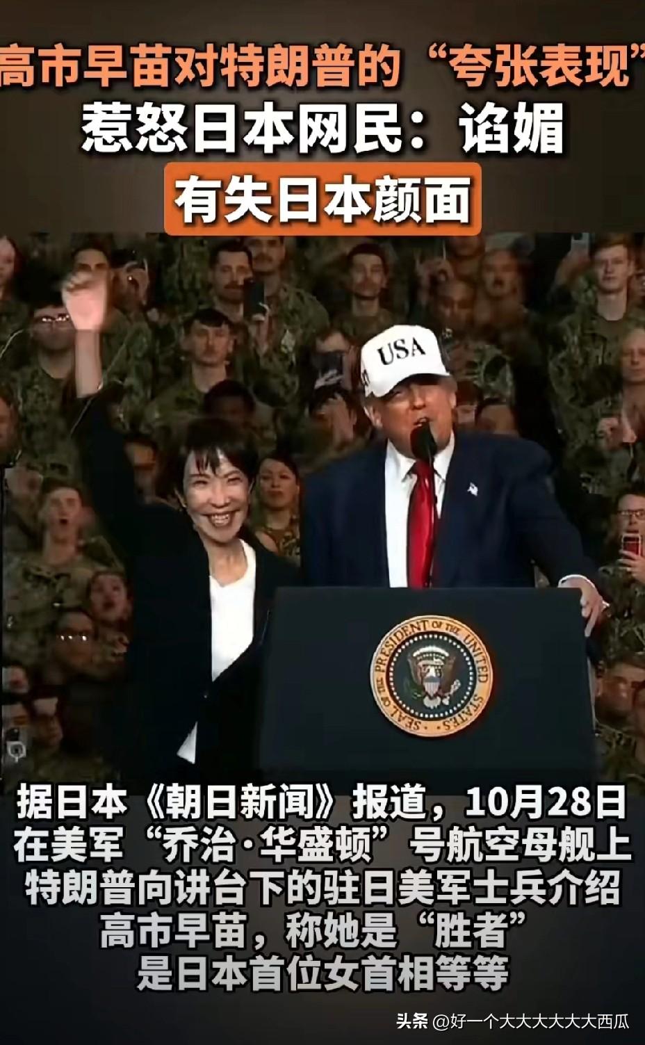 日本网民怒批高市早苗谄媚表现, 他们说高市早苗的行为让他们感到羞耻, 怎么能献媚到这种地步。 反过来看石破茂从来不会有这种表现, 可是最终高市早苗不还是你们日本人自己弄出来的首位女首相吗, 她做的任何事情和决定那就该你们日本人承受咯。 当年高市早苗的师父安倍晋三不就是这样, 只不过说她尽得师父真传而已。