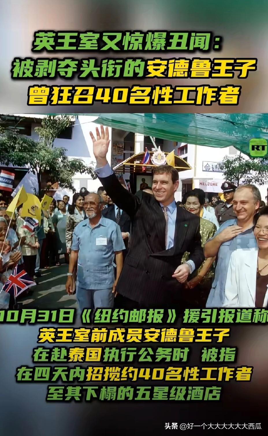 英国王室又曝出丑闻! 在泰国4天招妓约40名, 明明能住大使馆却要住5星级酒店, 花的还是纳税人的钱。 这就是英国王室成员安德鲁王子, 而且他好像还跟爱泼斯坦关系匪浅。 英国王室估计都已经受不了这安德鲁的种种陋习, 终于发出声明剥夺安德鲁的所有尊号、头衔和荣誉, 并且要求他搬离王室住所。 但这是被发现了的, 那些没发现的还有没有就细思极恐了, 那些生下来就在罗马的人有这样的情况并不奇怪。