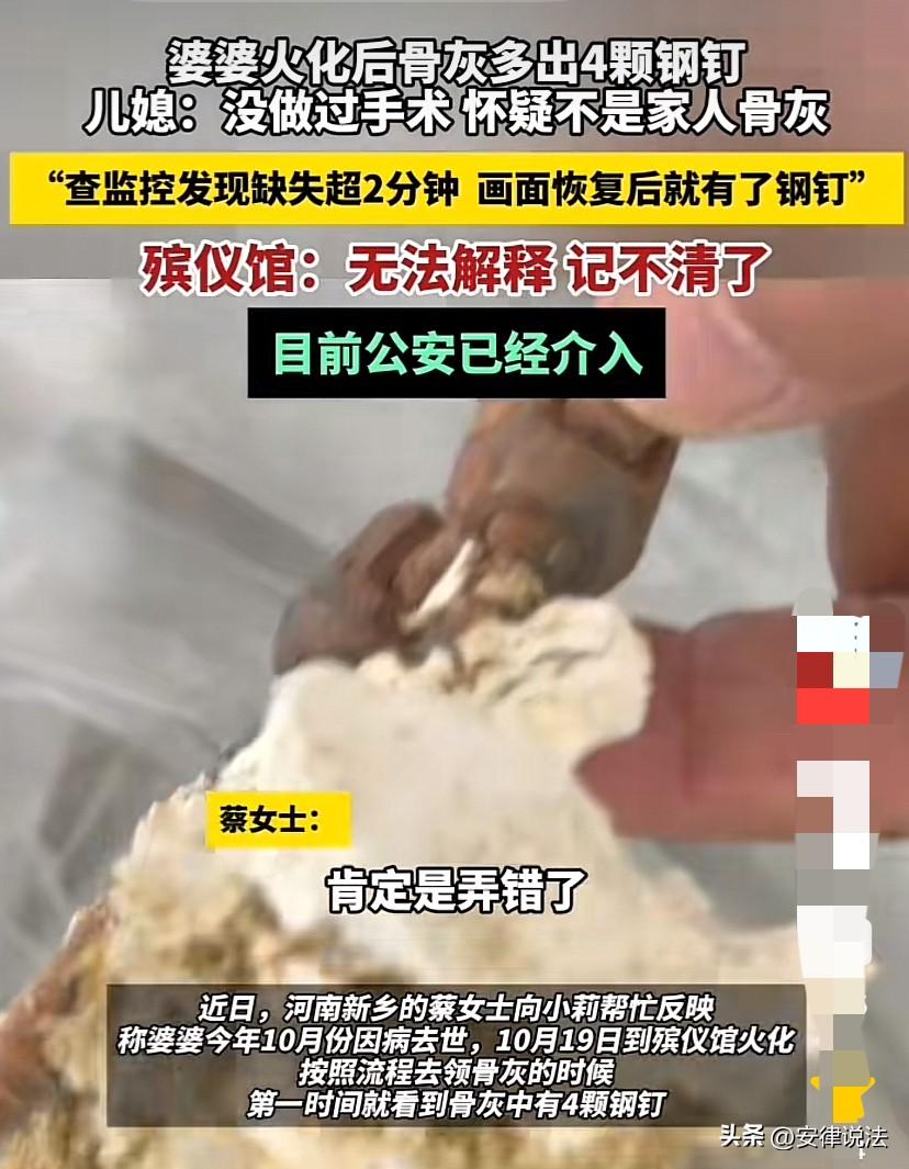 “奇了怪了!”河南新乡,9旬老人因病去世,遗体火化后骨灰中竟然出现4根钢钉。家属声称老人生前没有做过任何手术,质疑殡仪馆弄错了骨灰!殡仪馆予以否认,但是监控却缺失了2分多钟。殡仪馆解释,监控缺失是线路老化所致,但是老人的家属仍有疑虑,怀疑缺失的2分多钟的监控里可能隐藏着关键信息。 据悉,蔡女士的婆婆生前患有“心房颤动、心功能不全”30年、“脑梗死”10年,长年卧床。 这么多年都是蔡女士照顾的婆婆。 今年10月份,蔡女士的婆婆因病情加重不幸去世。 蔡女士带着沉痛的心情和家人一起给婆婆办理了后事,并按照规定将婆婆的遗体送往殡仪馆火化。 结果,在领取婆婆的骨灰时,发现婆婆骨灰里竟然多出来4根锈迹斑斑、长度约2厘米的钢钉。 因为其中两根钢钉还和残余的骨头连在一起;再加之从来不知道婆婆生前做过手术,家里的其他人也都说婆婆生前没有做过任何手术;婆婆最后一次入院的记录、病历和CT检查报告,也显示老人生前没有做过手术,体内也无任何金属植入,蔡女士全家人都怀疑殡仪馆弄错了骨灰,不敢下葬。 但是面对蔡女士一家人的质疑,殡仪馆却予以否认,表示整个操作过程都有监控记录,并强调火化流程是“一炉一人”,不存在多具遗体混杂的情况。 为了弄清真相,蔡女士将此事曝光给记者。 采访中,蔡女士与记者一同前往殡仪馆查看了监控。结果发现,在完成火化、打开炉子时,监控中能够清晰地看到骨灰中没有钢钉。 然而,在骨灰被推向收取处时,监控画面突然消失了两分多钟。 待监控恢复后,已经是家属进入现场发现骨灰中多出了四根钢钉的画面。 虽然,殡仪馆解释监控缺失应是线路老化所致,而之所以前面没有看到钢钉,后面又发现了,可能是钢钉原本就在骨灰里,摊开骨灰才先显现出来,但是蔡女士一家人仍有疑虑,怀疑缺失的2分多钟的监控里可能隐藏着关键信息。 据悉,目前,当地警方等部门已经介入。 殡仪馆弄丢骨灰盒、弄错骨灰盒的事情并不是个例。蔡女士碰到这样的事情,有所怀疑合情合理。 从法律上来讲,蔡女士一家将婆婆的遗体交给殡仪馆火化,与殡仪馆建立了相应的合同关系。将蔡女士婆婆的遗体火化并将骨灰交给蔡女士一家人是殡仪馆的义务! 《民法典》第509条规定,当事人应当按照约定全面履行自己的义务。 第577条规定,当事人一方不履行合同义务或者履行合同义务不符合约定的,应当承担继续履行、采取补救措施或者赔偿损失等违约责任。可以协商解决。 如果最终证实,确实是殡仪馆不小心把蔡女士婆婆的骨灰弄错了,其实就是违约,需要承担违约责任。 还应当注意的是,骨灰是延伸死者身体利益的载体,死者的骨灰对于死者近亲属具有精神价值,影响近亲属的精神利益。 根据《民法典》第1183条规定,侵害自然人人身权益造成严重精神损害的,被侵权人有权请求精神损害赔偿。因故意或者重大过失侵害自然人具有人身意义的特定物造成严重精神损害的,被侵权人有权请求精神损害赔偿。 如果最终证实确实是殡仪馆不小心把蔡女士婆婆的骨灰弄错了,蔡女士除了要求殡仪馆承担违约责任外,还可以要求殡仪馆赔偿相应的精神损失费。 这事您怎么看?欢迎在评论区留言,与大家一起交流您的看法! ------ 关注@安律说法 案例中看人生百态,法律中寻破局之法!