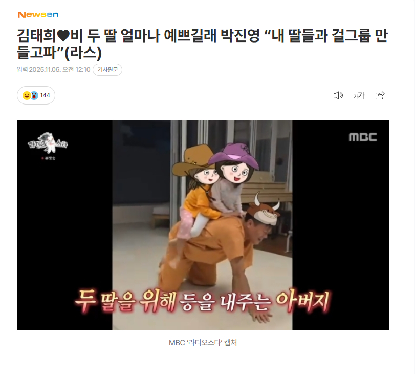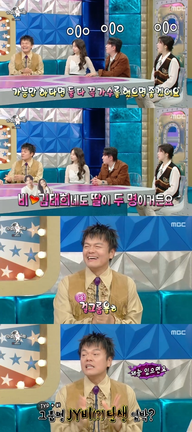 朴振荣还透露了自己的愿望:"现在Rain和金泰希家也有两个女儿。好好培养,先确保这四个人,再额外加人组成女团(出道)。"