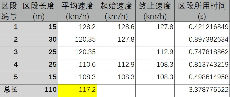 腾势官方的宣传片里,并没有一镜到底的镜头,只有区段1和区段4两段镜头。我们只能做一些粗糙的假设:1)腾势的GPS速度表准确无误,2)两段镜头出自同一次测试,3)在每个区段中车速是均匀下降的。利用区段1和区段4的起止速度,可以估算出区段1-4的平均速度,区段5按匀速计算。(图4)
