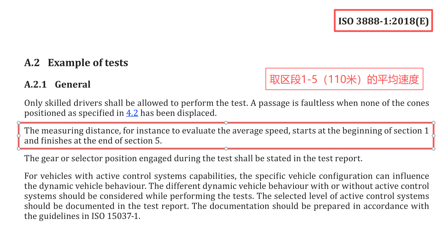 我的猜测是,按照ISO 3888-1标准要求,要求所记录的车速是通过110米的平均车速(图3)。或许是因为平均车速看着不够快,或许是为了和麋鹿测试保持一致,比亚迪的宣传中取的是进入桩区的车速,而不是标准要求的平均车速。不管怎么说,能按国际标准摆桩,已经是个可喜的进步了。