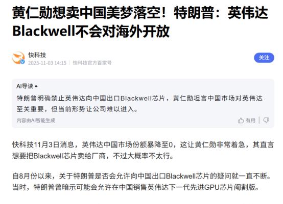 特朗普确定了!美国一步都不会让!   最近特朗普的一段采访算是把美国的小心思扒得明明白白,11月3号他在镜头前说得斩钉截铁,美国绝不能让别的国家拿到英伟达那款叫Blackwell的人工智能芯片,话里话外的意思很清楚,最担心的就是中国拿到这东西,怕咱们在AI竞赛里超过他们。   这话一出口,谁都能看明白,美国这是要在科技领域跟全世界明着较劲了,为了自己的霸权地位,连遮羞布都懒得用了。   可能有人还不清楚这Blackwell芯片到底有多金贵,简单说,现在搞人工智能,尤其是训练那些能跟人聊天、做科研的大模型,没有顶尖芯片根本玩不转。   英伟达这款新芯片比之前的型号性能翻了好几倍,不管是自动驾驶、新药研发还是高端制造业,有了它就能事半功倍。   美国心里跟明镜似的,谁先掌握这种顶尖芯片,谁在AI时代就有话语权,所以攥着不放的心思比谁都重。   其实这也不是美国第一次干这种事儿了,2023年他们就搞过一次AI芯片禁令,把A100、H100这些主流型号都列进了禁售名单,当时就把不少企业搞得措手不及。   可美国忘了,现在的产业链早就是全球连在一起的,你卡别人的脖子,自己的企业也得跟着遭罪。就说英伟达吧,之前因为禁令,光是中国市场的营收就少了好几十亿美元,逼得他们不得不专门搞针对美国限制的"特供版"芯片,可性能打了折扣,市场反响根本不行。   英伟达老板黄仁勋早就在公开场合警告过,这种制裁根本拦不住技术发展,只会逼着其他国家自己搞研发,最后反而会让美国失去市场。这话现在看一点不假,特朗普这回又盯上Blackwell,明着是限制别人,实际上是把自己的企业架在火上烤。   更有意思的是,美国在芯片上卡脖子还不算完,在关键资源上更是一点情面都不留,就说稀土这东西吧,跟芯片算是"黄金搭档",制造芯片、新能源汽车、军工设备都离不开它。   可美国偏不,反而在稀土问题上态度强硬得很,一边自己不开采本土稀土,怕污染环境,一边又联合盟友搞什么"稀土供应链多元化",想摆脱对中国的依赖,甚至还想在价格和出口上给咱们设限制。   这算盘打得够精的,自己省着不用,靠别人的资源发展,还得反过来卡别人的脖子。其实美国这么折腾,核心就一个心思:想永远攥着科技霸权,自己说了算。   他们总觉得只要把高端技术和关键资源攥在手里,就能卡住其他国家发展的脖子,确保自己一家独大。   这种霸权逻辑早就在美国的科技政策里根深蒂固了,从之前打压华为5G,到后来限制芯片制造设备出口,再到现在盯上Blackwell和稀土,本质上都是一回事:见不得别人比自己强,更怕自己的霸权地位被动摇。   美国的霸道行径,其实已经开始遭到反噬了。最明显的就是芯片领域,咱们中国的企业和科研机构早就开始发力,今年9月英国《金融时报》就报道,中芯国际已经在测试咱们本土生产的DUV光刻机了。   这机器虽然不是最顶尖的EUV,但已经能处理28纳米工艺,通过多重图案化技术还能勉强做到7纳米级别,这可是打破了美国多年的封锁。   搞出这台机器的裕量晟科技,据说还是华为生态链的企业,从2023年低调研发,到2025年就拿出了样机,比业界预期的早了整整五年。虽然现在良率只有国际水平的70%,但这已经是天大的突破了,说明美国想靠封锁卡住咱们的脖子,根本就是痴心妄想。   不光是中国,其他国家也受不了美国的霸道。欧洲的德国、法国早就开始搞自己的AI研发计划,拿出专项资金支持本土企业。   韩国三星也在加大芯片研发投入,想摆脱对美国技术的依赖;就连美国的盟友日本,也在偷偷和中国搞稀土合作,毕竟企业要生存,总不能跟着美国一起赔本。   之前美国逼着盟友不准用华为5G设备,结果不少欧洲国家阳奉阴违,该用还是用,因为他们知道,跟美国走只会让自己的通信产业落后。现在美国又想在芯片和稀土上故技重施,只会让更多国家看清它的霸权本质,反而会加速形成对抗美国霸权的合力。   说句实在话,美国现在的做法就是典型的"霸权焦虑症",越怕被超越就越搞封锁,越搞封锁就越激发别人的斗志,最后形成恶性循环。   就像稀土领域,美国虽然喊着要多元化供应链,但中国不仅是最大的稀土生产国,更是掌握了90%以上的稀土加工技术,就算美国能从其他国家买到稀土矿石,最后还得运到中国来加工,这种产业链的优势,不是靠政治施压就能改变的。   芯片领域更是如此,全球20万亿的市场蛋糕,美国想独吞根本不现实,现在中国在光刻机、芯片设计软件上都在突破,其他国家也在发力,美国的垄断地位早晚会被打破。   特朗普喊着"一步都不让",看似强硬,其实暴露的是美国内心的不自信。他们忘了,科技发展的本质是开放合作,不是闭门造车。   当年美国能在科技领域领先,靠的就是吸引全球人才和技术交流,现在反而搞起了封闭和封锁,无异于自断臂膀。