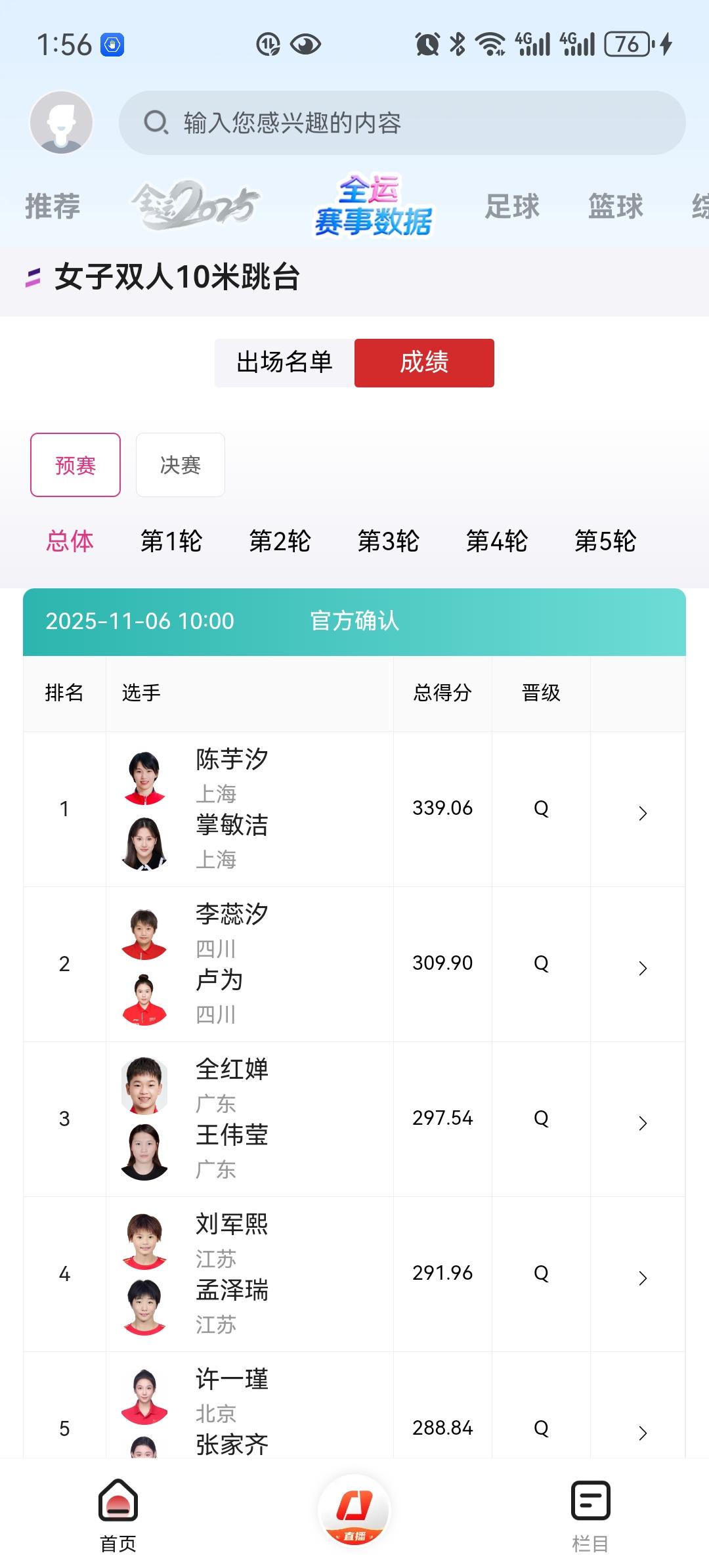全运会女子双人10米跳台再现全红婵大战陈芋汐!在上午进行的预赛中,上海组合陈芋汐/掌敏洁以明显优势排名第一,广东组合全红婵/王伟莹则表现一般仅列第三。不过预赛分数并不会带入决赛,所以双方在决赛中的争夺预计仍然会非常激烈!在全红婵已经确定不参加单人比赛的情况下,这场双人对决也许才是本届全运会跳水流量最高的一场比赛。