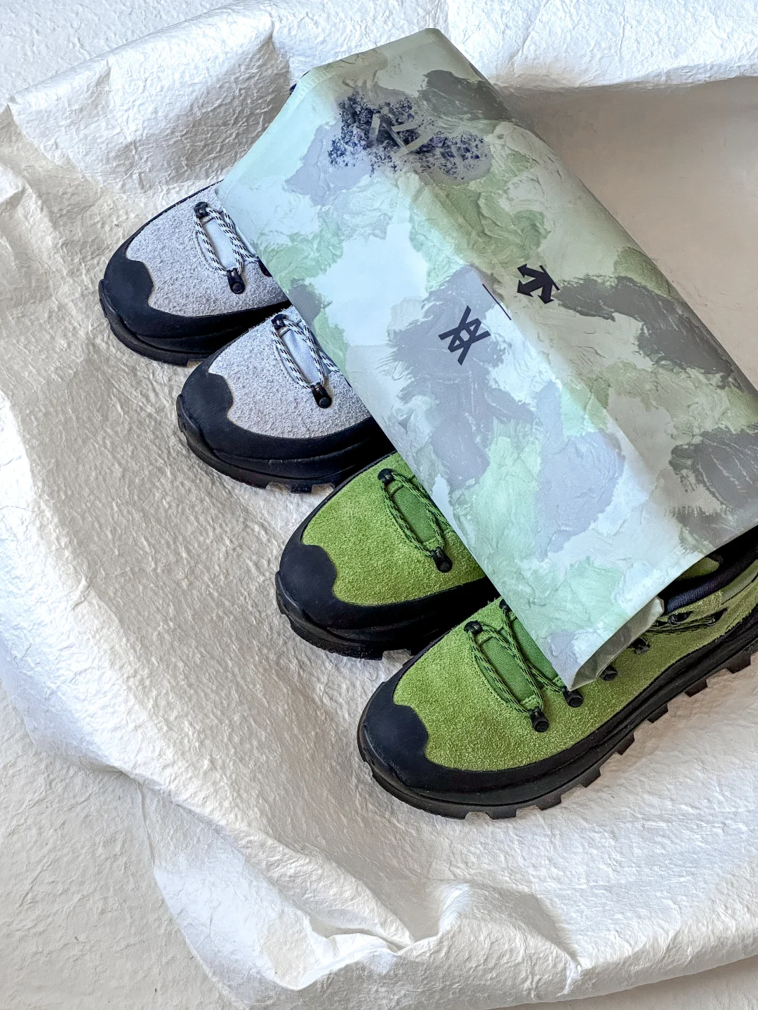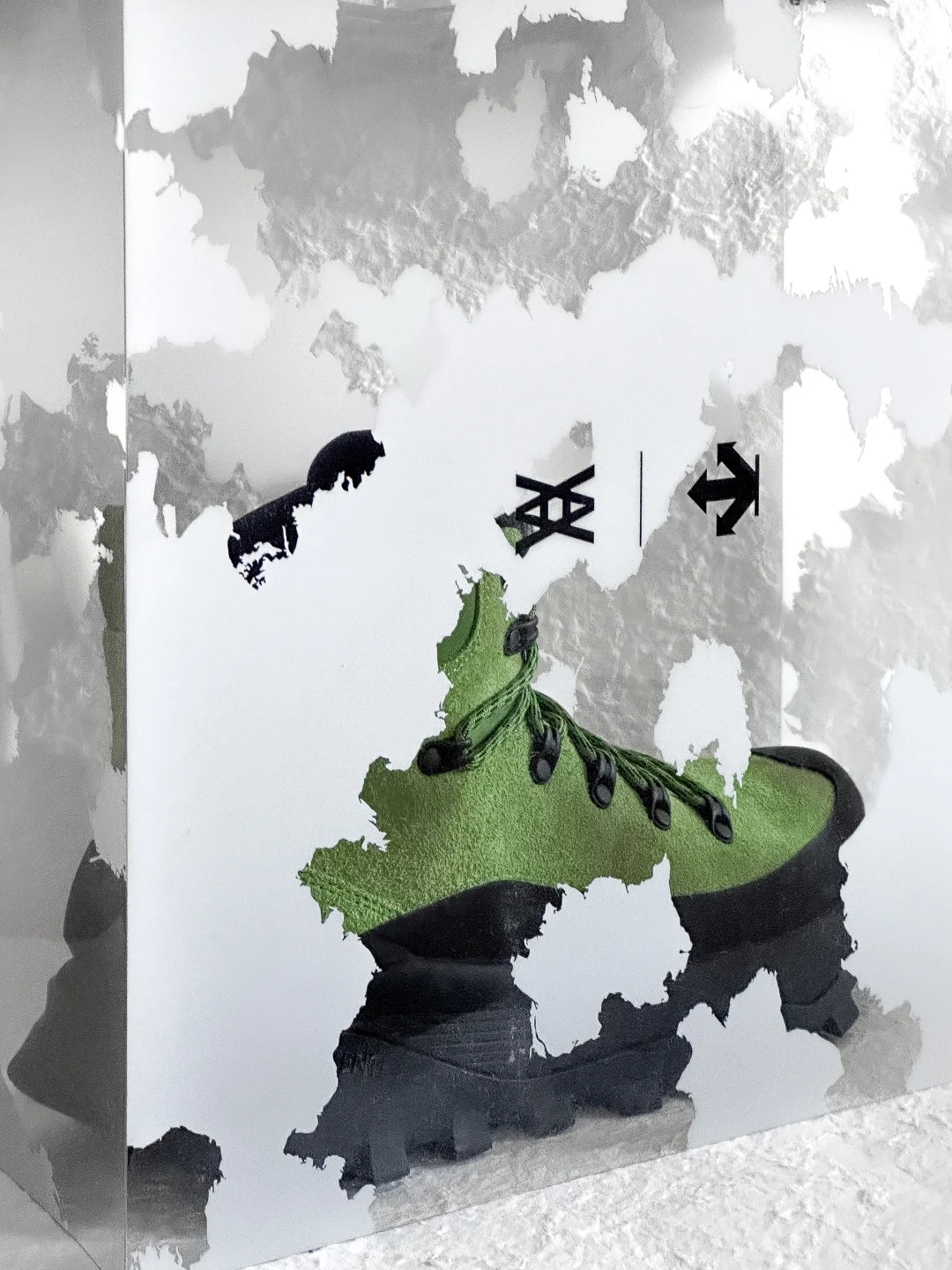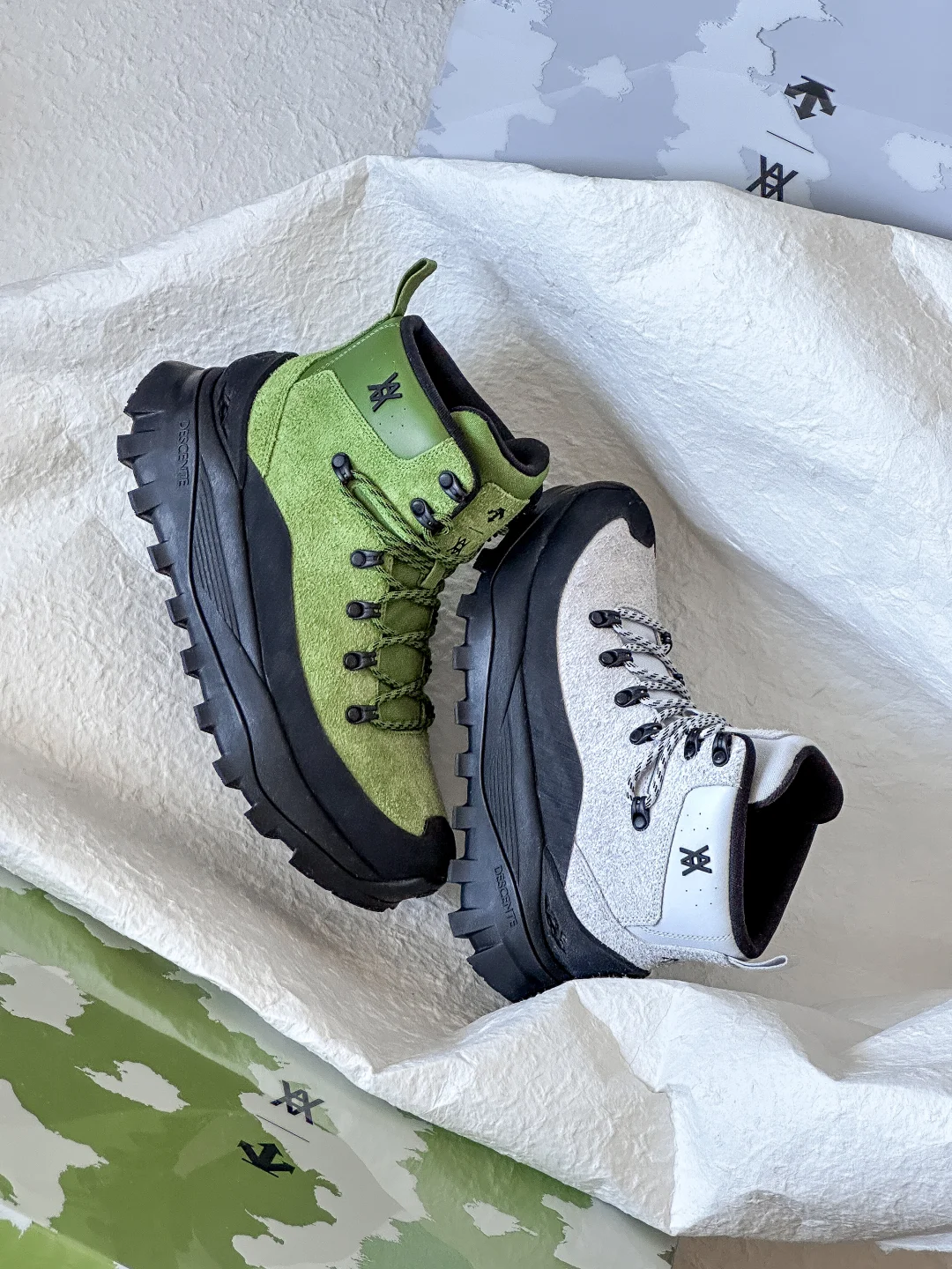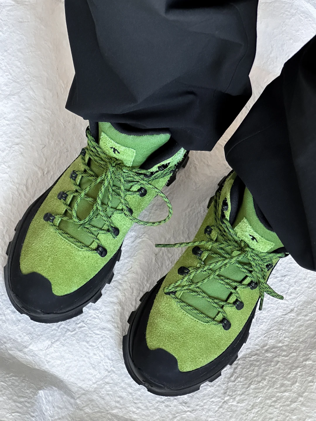 鞋型充满艺术感的简洁轮廓,一看就是Daniel Arsham的风格。配色很懂人心,男款是森林感的绿色,女款是冰雪感的白色,麂皮包覆的鞋面质感高级,冬天穿既显格调又很有 “冬日山野” 的氛围感。