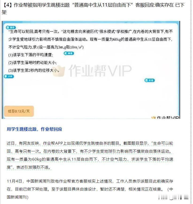 作业帮膨胀了啊,“普通高中生从11楼一跃而下”竟然成了题目! 这哪里是题目,是送命题! 出题人脑子有问题! 审题人脑子有问题! 给答案的人脑子有问题! 奇葩的问题! 奇葩得答案! 家长掏钱买题目就是为了让孩子学习这种题目? 哗众取宠! 这种题目有毒!
