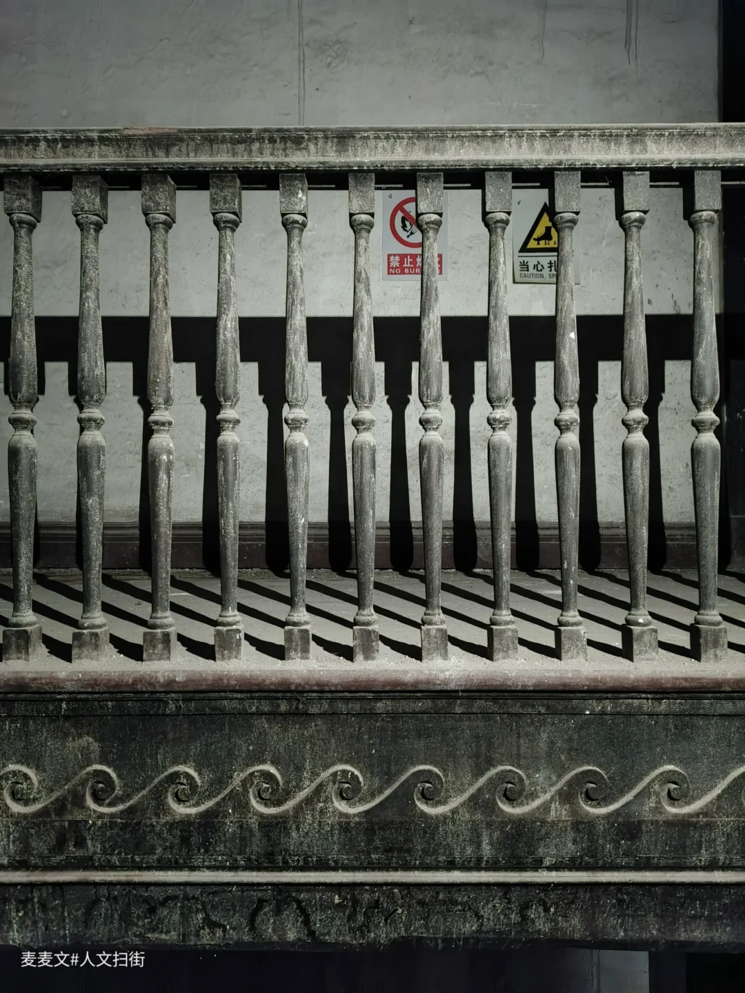 环绕式的铜艺栅栏也是一大亮点,上面的铜花虽经时光洗礼,却依旧清晰可辨,散发着古朴的韵味。沿着环绕式外阳台走一圈,长度差不多近百米,在漫步的过程中,还能看到黄色的小块状地砖,为整个空间增添了一抹别样的色彩。