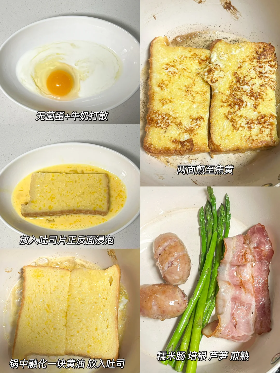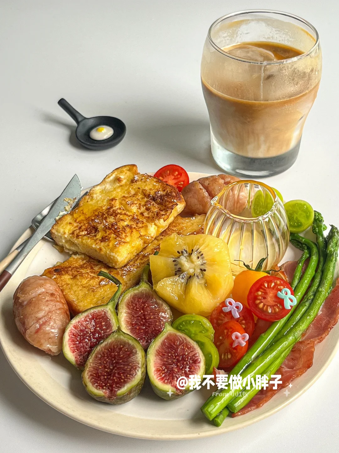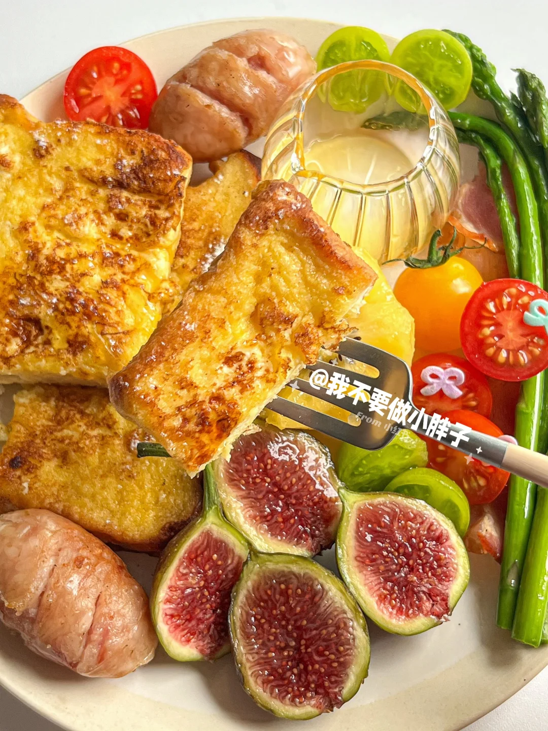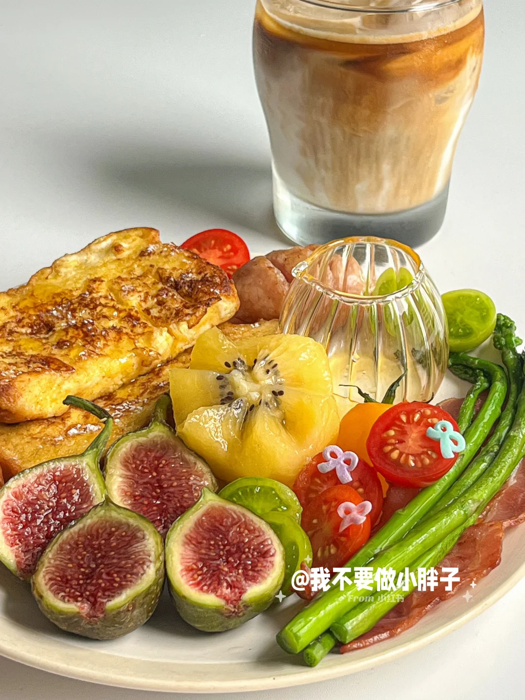 - 🥛 厚乳拿铁 🍞 蜂蜜法式吐司 🍖 煎糯米肠 培根 芦笋 🥝 奇异果 无花果 小番茄 - 1.无菌蛋+鲜奶打散,放入吐司片两面浸满蛋液 2.锅中融化黄油,放入吐司片,两面煎至焦黄 3.培根 芦笋 糯米肠煎熟 - 💭 奶香的法式吐司淋上蜂蜜别有一番滋味!