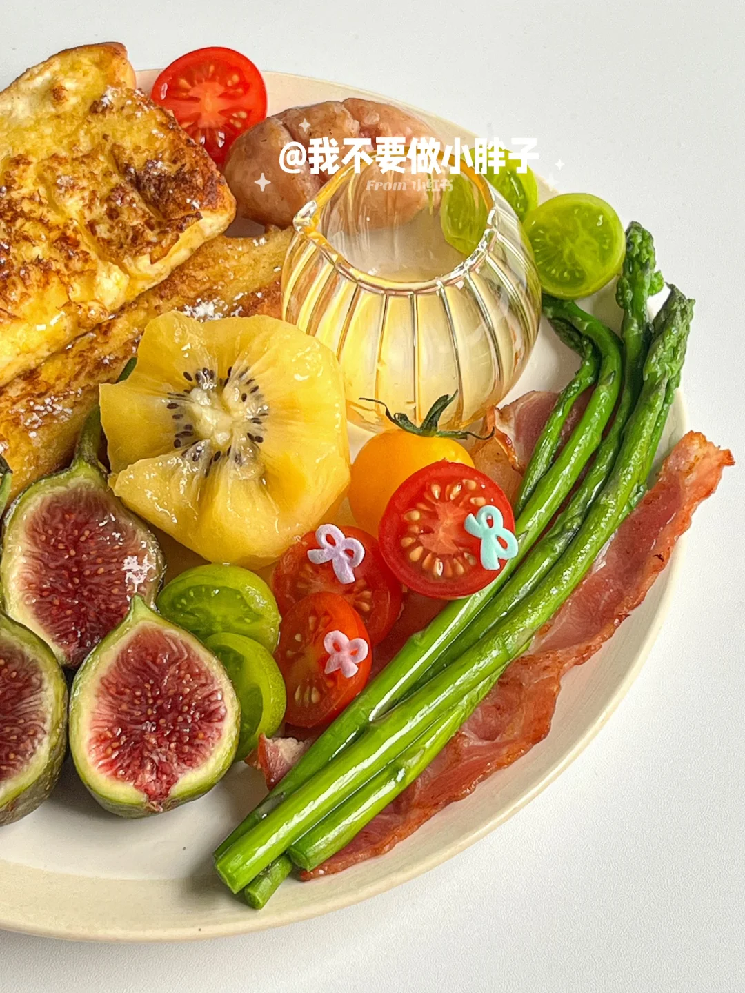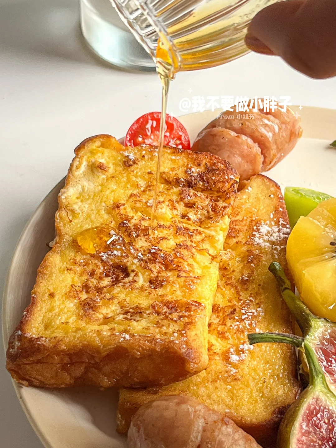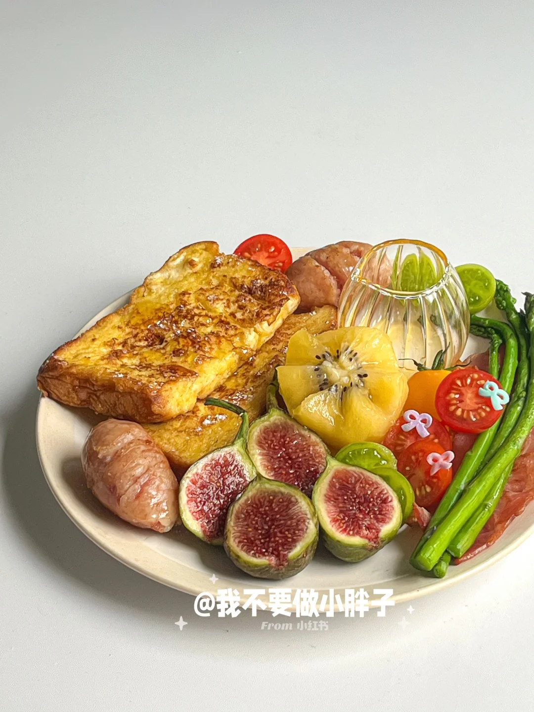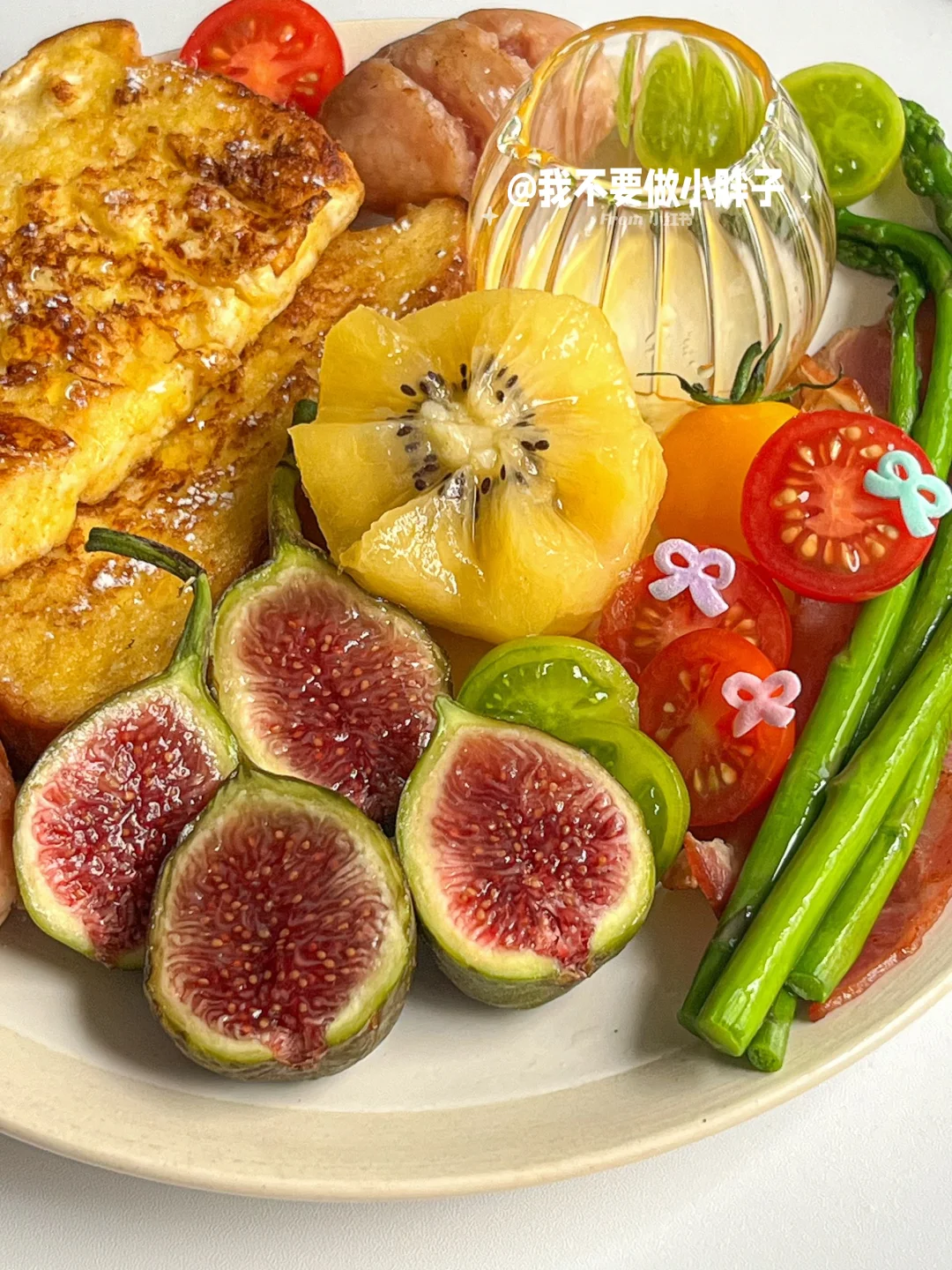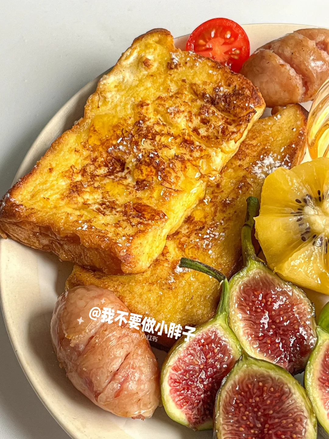 - 🥛 厚乳拿铁 🍞 蜂蜜法式吐司 🍖 煎糯米肠 培根 芦笋 🥝 奇异果 无花果 小番茄 - 1.无菌蛋+鲜奶打散,放入吐司片两面浸满蛋液 2.锅中融化黄油,放入吐司片,两面煎至焦黄 3.培根 芦笋 糯米肠煎熟 - 💭 奶香的法式吐司淋上蜂蜜别有一番滋味!