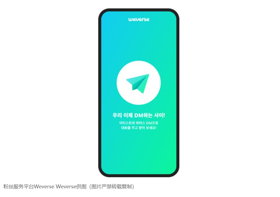 “Weverse DM”服务是粉丝与艺人可以直接进行一对一聊天的付费通信服务,支持14种语言自动翻译。目前,TOMORROW X TOGETHER(TXT)、LE SSERAFIM等K-POP偶像团体及演员边宇锡等人入驻Weverse。
