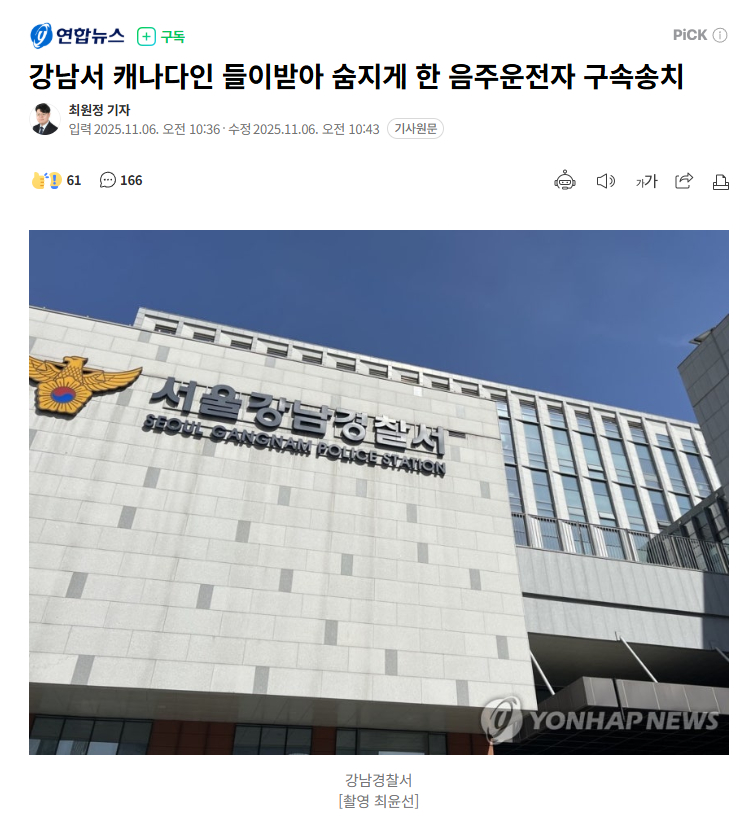 在首尔江南区,一名30多岁的男子在醉酒驾驶状态下,撞上正在人行横道过马路的加拿大人并致其死亡,目前该男子已被逮捕并移交检方。