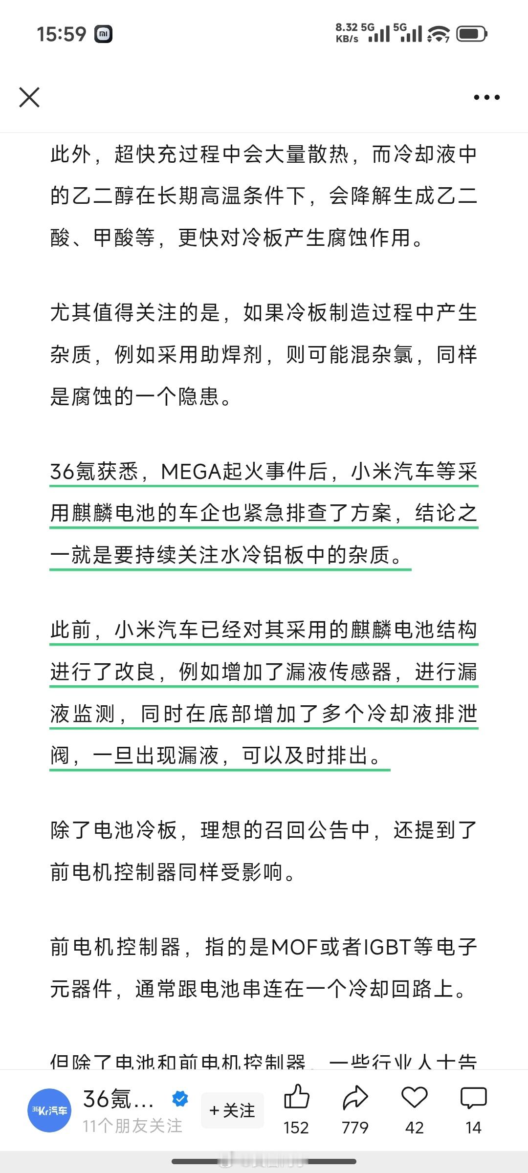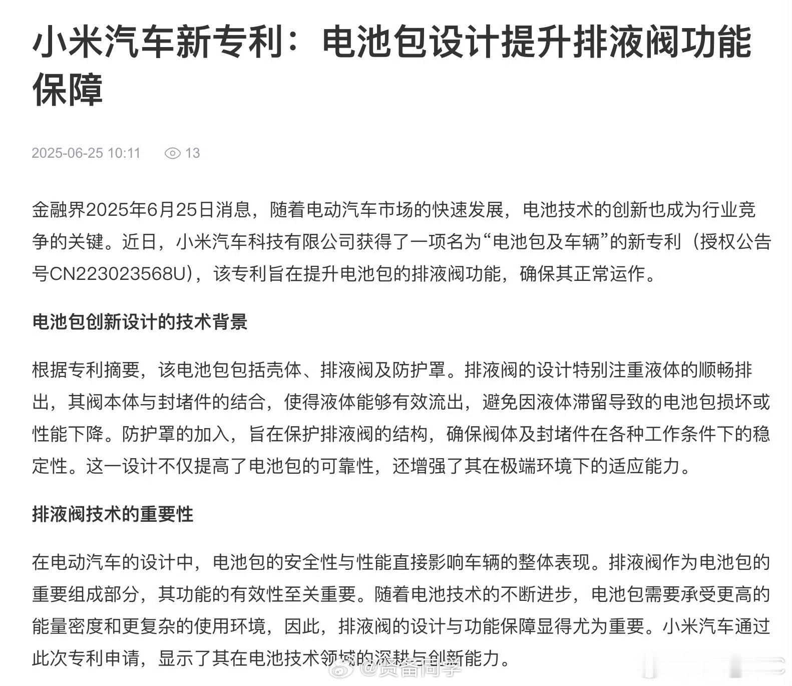 “此前,小米汽车已经对其采用的麒麟电池结构进行了改良,例如增加了漏液传感器,进行漏液监测,同时在底部增加了多个冷却液排泄阀,一旦出现漏液,可以及时排出。”