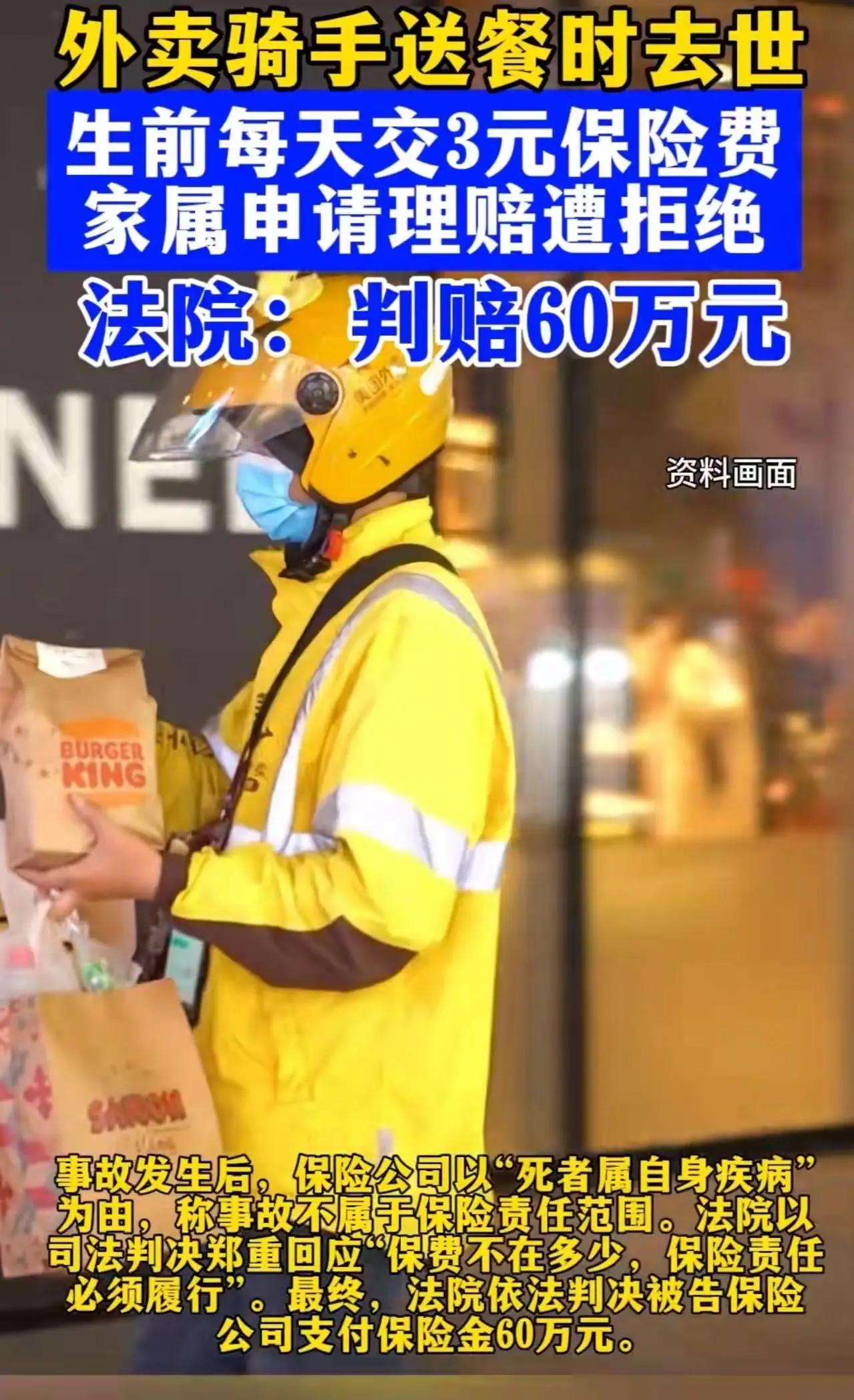 “这次保险公司输了!”郑州icon,外卖骑手送餐时去世,每天交3元保险费,却遭保险公司拒赔!而法院的判决,大快人心!法院:赔60万!网友:不但要理赔,还要加倍赔偿,不然他们不知道疼,只收钱不赔偿! 这起事件犹如一记重拳,狠狠击中了无数人的心,也让我们再次反思:在这个充满利益博弈的社会,谁才是真正的守护者?谁又在冷漠地站在一旁看着我们受伤?每天只花3元,却换来一场生死之际的“空头承诺”,这背后隐藏的,是多少普通人的无奈与悲哀。 想象一下,那位年轻的外卖骑手,或许只是为了多赚点生活费,奔波在城市的街头巷尾。他们的辛苦、危险、甚至生命的脆弱,都被无情的数字所掩盖。3元的保险费,似乎微不足道,却承载着他们对未来的希望和一份安全感。而当真正的危机降临时,却被“拒赔”的冷漠击碎了所有的期待。 法院的判决像是一股清流,让我们看到了正义的光芒。60万的赔偿金额,似乎还不足以弥补那位骑手失去的生命,但至少,是对生命价值的肯定,是对那些在无形中被剥夺权益的普通人的一种守护。这场官司,不仅仅是一次法律的胜利,更是一场关于人性和尊严的胜利。 然而,网友们的反应更令人深思。“不但要理赔,还要加倍赔偿”,这句话道出了多少人的心声。我们不只是希望得到应有的赔偿,更希望这个社会能给每个普通人一点点温暖和尊重。生命的价值,绝不能用几元钱的保险费来衡量。那些默默奉献、日夜奔波的外卖骑手,他们的生命,同样宝贵。 这件事情,也让我们反问:为什么如此多的保险公司,明明有责任,却选择逃避?他们是不是只看到了利润,而忽略了人性?我们需要的不仅是法律的公正,更是社会的良知。我们希望,未来的每一次投保,都不再只是数字游戏,而是真正的保障和守护。 这起案件的胜利,是对所有普通人的鼓舞,也是对那些冷漠无情的企业的一记警钟。我们期待一个更加公平、温暖的社会,让每个人都能在风雨中感受到一份真正的安全感。毕竟,生命没有“保险费”的价格,只有被尊重和珍惜的价值。这次保险公司输了,郑州,外卖骑手送餐时去世,每天交3元保险费。送外卖事故 送外卖猝死