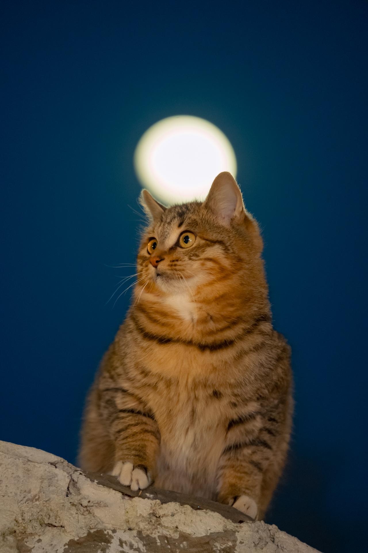 拍到了圆月下的鹰头猫。昨天在北京拍猫时遇见的,虎头虎脑的小胖狸,双眼睁...