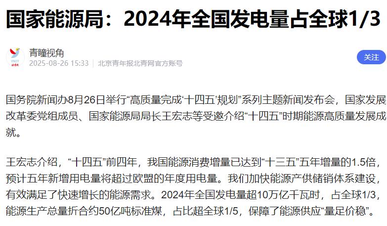 一个庞大的“电力帝国”正在崛起!!!   去年中国发了10.09万亿度电,而全世界总发电量也才31.2万亿度,这意味着咱们一家就承包了全球近三分之一还多的电力产出,这个数字放在十多年前简直不敢想象。   要知道美国去年发电量不过4.494万亿度,欧盟加起来也才2万亿度出头,咱们相当于两个美国再加半个欧盟的发电总和,这种量级差就像职业选手和业余爱好者同台竞技。   能撑起这么庞大的电力帝国,可不是靠简单堆规模,背后是一套从能源生产到传输再到消费的全链条硬核操作。   就说新能源领域吧,2024年全球新增的可再生能源装机里,中国占了足足72%,相当于每三个新安装的光伏板就有两个半在中国落地。   新疆达坂城的风电场一排排风机转起来,那场面比好莱坞大片里的未来基地还壮观,青海的光伏电站铺开在戈壁上,阳光一照连卫星都能看到这片"蓝色海洋"。   这些清洁能源不是摆样子的,去年光风电和光伏贡献的电量就够整个日本用一年,这还没算上三峡、白鹤滩这些水电巨无霸,尤其是白鹤滩水电站的机组一转,单机容量就相当于一个中小型城市的用电需求,难怪外媒说中国把能源建设玩成了"基建狂魔"的升级版。   电力发出来还得送得出去才能有用,这就不得不提咱们的特高压技术,别人还在纠结跨省输电损耗的时候,中国的特高压线路已经像"电力高速公路"一样铺满全国,从新疆的风电到华东的工厂,几千公里的距离电损比手机充电还低,这种技术实力让不少国家眼馋到不行,纷纷上门求合作。   而支撑这么多电力消耗的,除了传统制造业外,数字经济更是个"用电大户",2024年中国数据中心用电量占了全球25%,那些支撑AI算力的超算中心,一个机房的耗电量就抵得上10万户家庭,难怪有人调侃说现在连ChatGPT都得靠中国电力"喂饭"。   更难得的是,咱们的电力帝国不是全靠烧煤堆出来的,非化石能源占比一年比一年高,去年已经接近三分之一,这种绿色转型速度,让那些喊着减碳却连核电都不敢建的国家情何以堪。   从西部的风电场到东部的智能电网,从深山里的水电站到城市里的充电桩,中国正在用电力编织一张覆盖生活方方面面的大网,这样的电力帝国,难怪连国际能源署都要专门出报告研究中国模式。