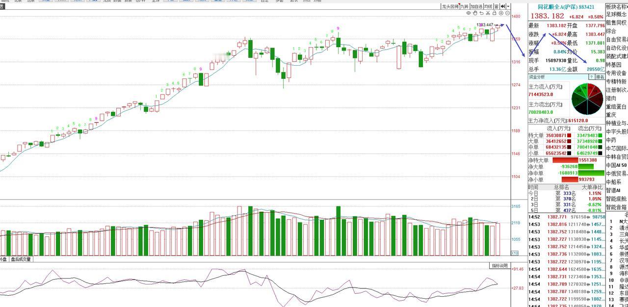 中期顶部确定,Ai芯片科技利用利好诱多! 目前整体还是属于反抽反弹的调整周期,还没见底 这个位置就是出货 有利好出货就容易点,没利好就向下打些空间腾挪。 今日整体科技股强势,但在利好加持下整体一般 昨天晚上外媒报道国资的数据中心要求不能使用国外芯片 今日寒王和海后盘中大涨,带领芯片半导体上涨,但整体跟随一般,科创综指涨2.5%,科创5涨3.34,和之前动不动6%的上涨相比,还是弱的,说明这个位置资金还是不愿意向上的,最主要就是今日增量不明显,上午早早放量1000多亿,但是明显的冲高回落,下午指数强势,但量能相对是萎缩的。 算力的易中天受外围CPO大涨超25%影响高开,但走势不强,虽然今日有个也发布了业绩,盘前上涨11%,但对国内CPO的影响有限,基本都是利用利好高开低走的多。 下午人形机器人异动,主要是小鹏昨日展示的女士机器人走猫步,被批藏人了,今日中午何小鹏发视频一镜到底展示机器人,市场提振。从视频中看,何小鹏说走路,发出了指令,但隔了2秒机器人才动,我认为还不是完全智能化,还是有“遥控”的嫌疑。 人形机器人还是看特斯拉的擎天柱。所以特拉斯股价强,机器人就不会差。我们这边还只是随消息的轮动反弹,一天3个大消息影响了3个“权重”板块。指数要强一些。 从同花顺全a看,今日量增,但价明显小很多,分化较大,轮动反弹,后续主要以震荡调整为主。 短期走势受消息影响较多,但只影响了中期顶部的构造,新高一点也不是突破。主要看每一次底部的构造。