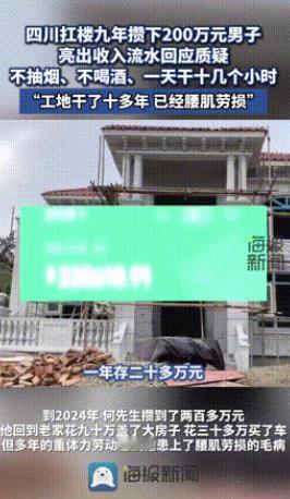 “钱赚够了人也快没了!”四川,90后男子工地搬砖9年,攒下200万买房和30多万的车!不抽烟喝酒,一天干十几个小时不停,一天最高收入1000多!网友:怕是离累死不远了! 近日,一位来自四川的90后小伙引发网络热议。他在工地辛勤劳作9年,凭借自身努力与坚持,成功积攒下超200万身家。此事一经曝光,便在网络上掀起轩然大波。 有人说这是拿命换钱,太不值;也有人赞他励志,是年轻人该学的榜样。 可这些标签,都太简单了。这根本不是一场赌上性命的冲动,而是一场长达九年,以自己身体为唯一本钱的、清醒又残酷的经营。何妨翻开他这本别具一格的人生账本,一探究竟。那账本里,藏着岁月故事、生活感悟,或许能让我们于字里行间,窥见别样的人生景致。 在这本账的“负债”那一页,起始金额并不是他欠了谁的钱,而是他生来就背负的责任。 他家里穷,父亲当年工伤残疾,没钱好好治;奶奶瘫痪了十年,每个月光药费就得三千多。这些就是他的“原始债务”。 2017年离了婚,女儿的未来,又成了他必须兑现的承诺。这一切,都得靠他去挣。 为了还清这些“债”,工地上的一切都成了他要支付的“利息”:每天干十几个钟头的活,夏天钢筋烫得后背脱皮,冬天手冻裂了血往外渗。 医生警告他腰肌劳损再发展下去就是腰椎间盘突出。他流的每滴汗,都是在为家里的账单付款。 很多人担心他,觉得“挣的钱还不够以后看病”。这话没错,但看漏了一点:他挣的钱,从来不是最终目的。 对他来说,一天一千多的工钱只是周转资金,必须尽快换成能给家人遮风挡雨的东西——安全感。 这笔钱的去向特别清楚:一部分,在县城变成了带电梯的房子,方便爸妈照顾奶奶上下楼。 另一部分,在老家盖起了新房,专门给女儿留了房间。他那辆三十多万的车,也不是为了显摆。 他想的是女儿回家再也不用挤大巴,是爸妈能舒舒服服地去镇上赶集。这些东西,才是他账本里真正的“固定资产”。 他还把银行卡密码设置成女儿的生日,这个小细节就好像在说:我挣的每一分钱,从一开始就知道要去哪儿。 做生意得有风控,当你的本钱只有身体时,怎么让它“用得久一点”就是天大的事。在外人看来,他这是在玩命,其实他有一套自己的“保本”方法。 他早就戒了烟酒。工友劝他,他说喝酒耽误第二天干活,还得花钱,更重要的是,不能糟践自己。这是一种长远打算。 他不买超过200块的衣服,吃得也简单,青菜豆腐就行。压低自己的生活开销,就能少干点极限的活,给身体一点喘息的机会。 他不是没听到身体的警报。花32块钱做了次推拿后,他摸索出了一套不花钱的保养方法:跟着工友学拉伸,收工了用热毛巾敷腰,再贴上膏药。 所以,当他说“现在腰已经不疼了”,可能不是在硬撑,而是他的这套方法,真起点作用了。 现在,这场长达九年的高强度投资,总算快要到期了。他开始放慢节奏,下午五点就收工,能看看女儿的视频。 他计划着,再干两年就回老家开个小超市,好好陪陪家人。 他用自己的身体,为家庭筑起了一道墙。这个故事最打动人的,不是他吃了多少苦。 而是一个资源匮乏的普通人,能用如此惊人的理性和规划,把自己当成唯一的杠杆,撬动了整个家庭的未来。