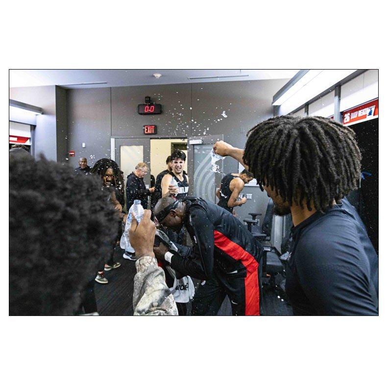 杜普里斯今天三分5中4,开拓者22分逆转的功臣,赛后享受了香槟浴