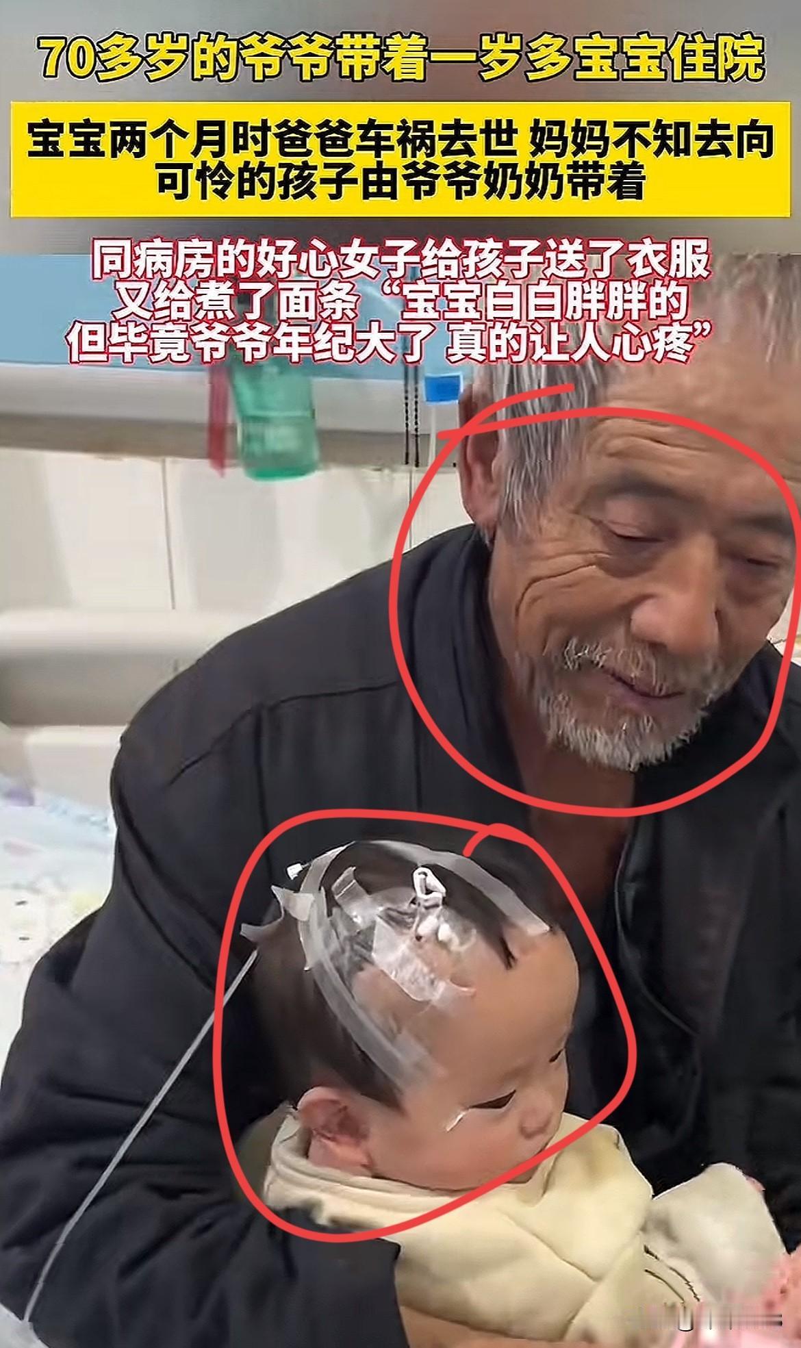 你们刷到这个1岁宝宝没? 一位女子看到病房里70岁的老人带着1岁的宝宝住院,后来得知孩子父亲在孩子两个月大时车祸没了,随后母亲也下落不明找不到了,看着宝宝被老人带的白白净净的很让人心疼!老人年纪也大了,本应该享受天伦之乐的年纪却要遭受白发人送黑发人,还要照顾宝宝,太让人心疼又让人觉得伟大了! 不少热心网友就给他们捐钱,这位好心人就把大家给的钱以现金的方式给到老人手里……这位女士也很善良,有你们这个世界真的很美好😊
