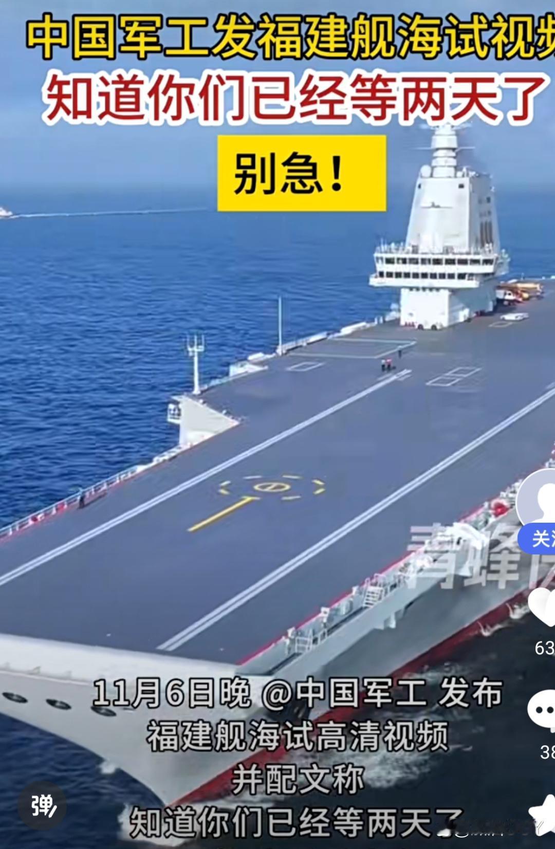 中国军工:知道你们等两天了 别急! 11月6日,中国军工通过官方渠道发布国产航母福建舰海试视频,并配文“知道你们等两天了,别急!”回应公众关注。 网友:威武霸气,期待早日入列![强][强][强]动态连更挑战