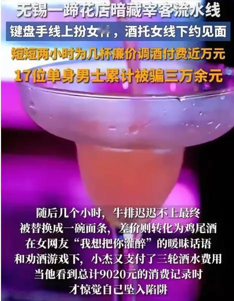 我想把你灌醉!女网友一句话,小伙两小时刷掉9020元,醒来直接报警! 这事儿发生在无锡一家蹄花店,看似普通的小店,背后竟藏着一条酒托流水线。键盘手线上假扮女神广撒网,酒托女线下约见面,专挑单身男士下手。点单时牛排变面条,廉价色素酒卖到上千元,全靠暧昧话术和好面子心理逼人买单。短短几个月,17人被骗走三万多! 为啥总有人上当?说穿了,就是利用了一些男生不好意思拒绝和对艳遇有期待的心态。真正的缘分,哪会一见面就逼你往死里花钱?法院最近判了!团伙头目坐牢一年罚一万,可算出了口气! 网恋见面长个心眼!对方要是主动带你去不熟悉的店消费,价格模糊还催付款,八成是陷阱。真心想交友的人,不会让你为一顿饭大出血!