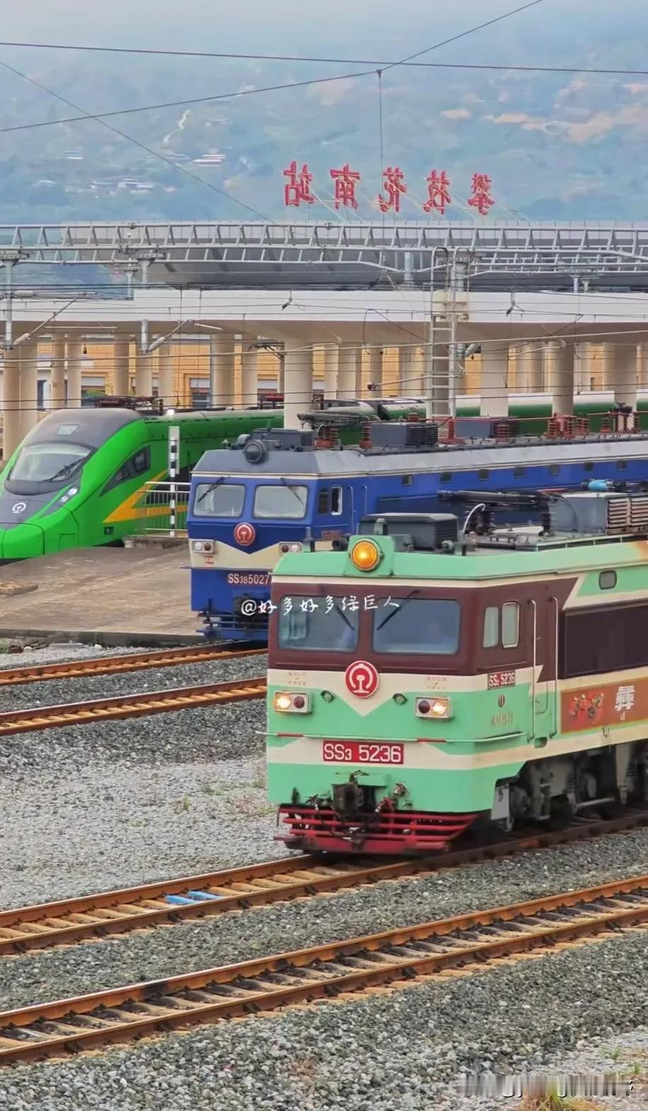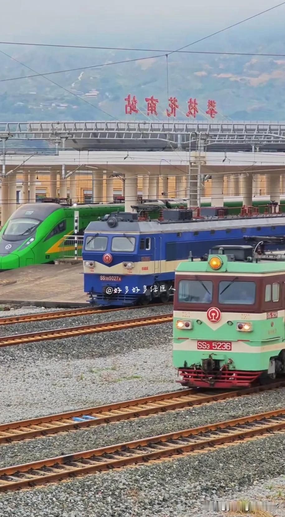 成昆铁路攀枝花南站内,牵引公益慢火车的韶山3与韶山3B大功率重联型货运机车、新型的垃圾桶CR200复兴号动车组合影。他们也算是见证了铁路的两个时代。成昆铁路一直也是西南地区一条非常崎岖的道路。近些年随着新成昆铁路复线的修通,大幅减少了原来的弯道半径,开行了更高速度的CR200复兴号动车组列车,大部分客运列车也驶上了新的铁路。原有的老成昆铁路上除了货运列车外,仅剩下了数对公益慢火车,连同公益慢火车,也保留了数台韶山3机车作为牵引车,其余的韶山三型电力机车也都走向了报废退役。